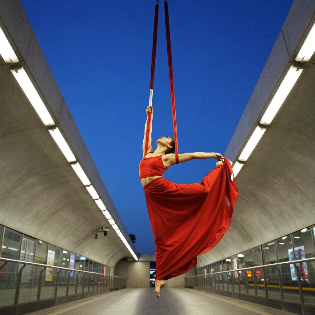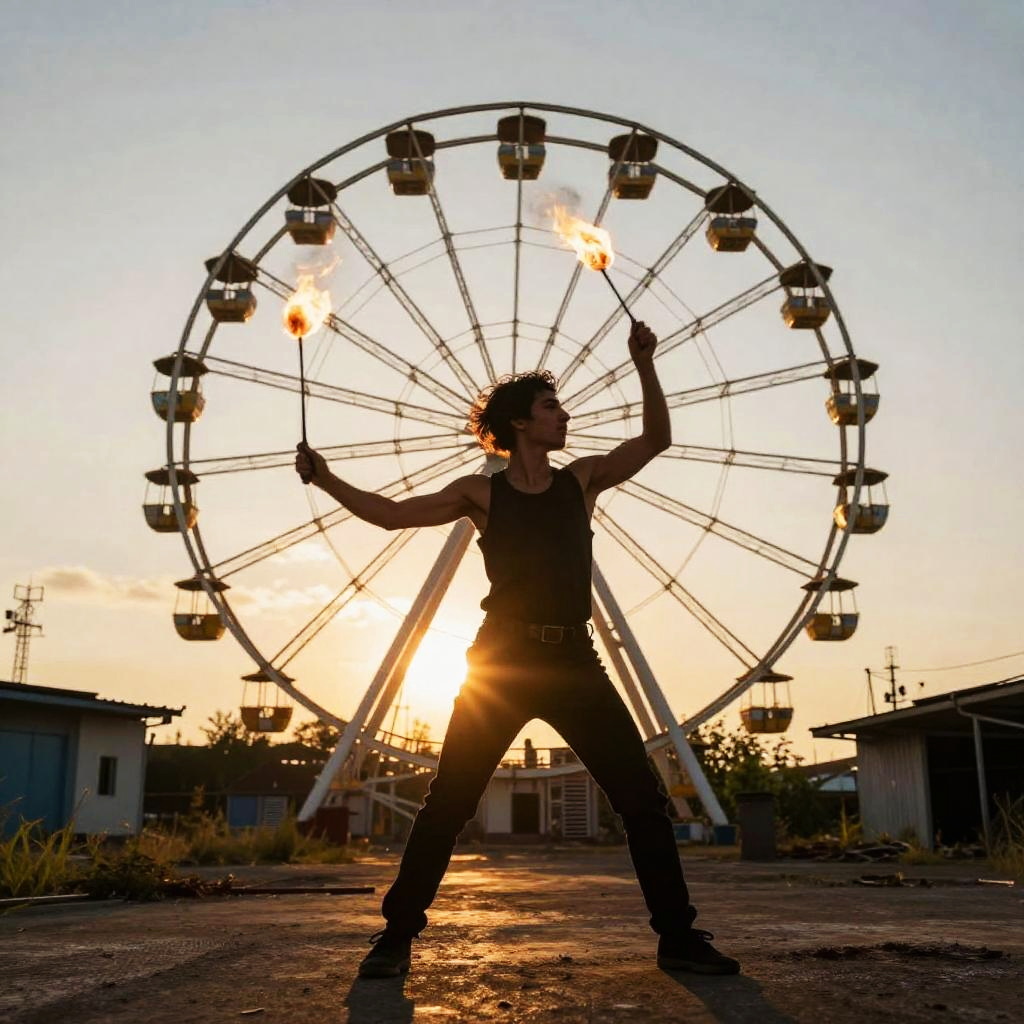 Female motocross rider in dirt-splattered leathers performing a wheelie in industrial waterfront at dusk with drifting fog and silhouetted shipping cranes, puddled concrete reflecting neon signage, captured with Sony A7R V with 70-200 mm f/2.8 GM, 1/1000 sec, f/2.8, ISO 400, low-angle action shot, cool muted tones, sharp focus with background bokeh, photorealistic.