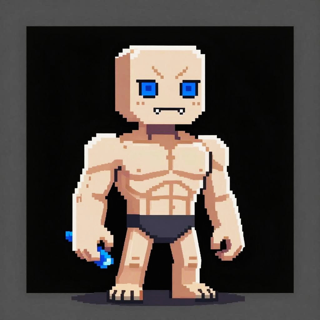 This is a digital drawing of a small, muscular, cartoonish alien with pale skin, bright blue eyes, and a square head with visible wrinkles. The alien has sharp teeth and is holding a blue object in its right hand while standing against a solid black background with gray borders. The style is pixel art, with bold, blocky colors and sharp lines.