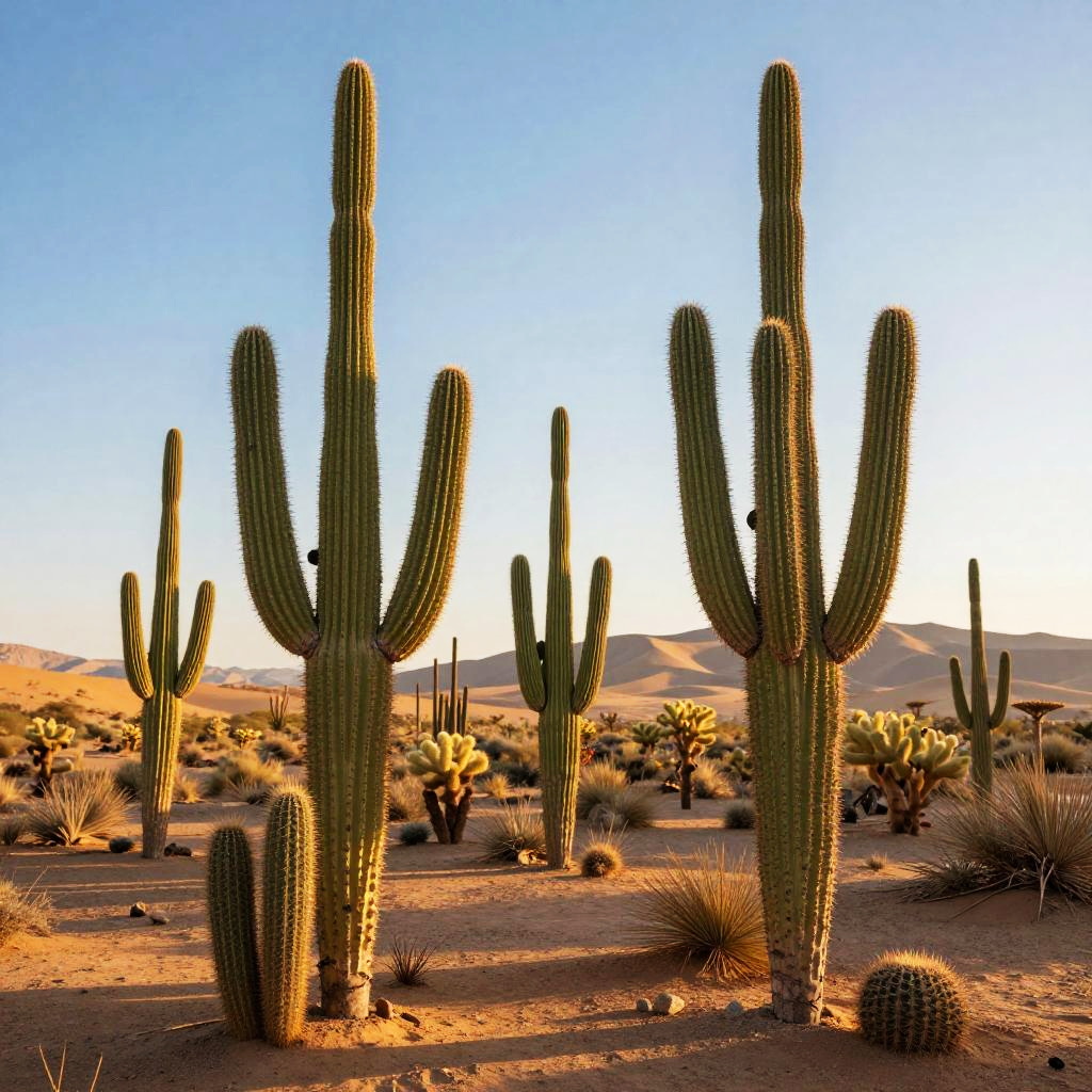 Photorealistic image of an ancient desert landscape featuring tall saguaro cacti and various desert plants under golden hour sunlight. The warm light casts long shadows on the sandy ground, highlighting the textures of the cacti and surrounding desert flora. Distant sand dunes and a clear blue sky create depth in this highly detailed, sharp focus composition.
