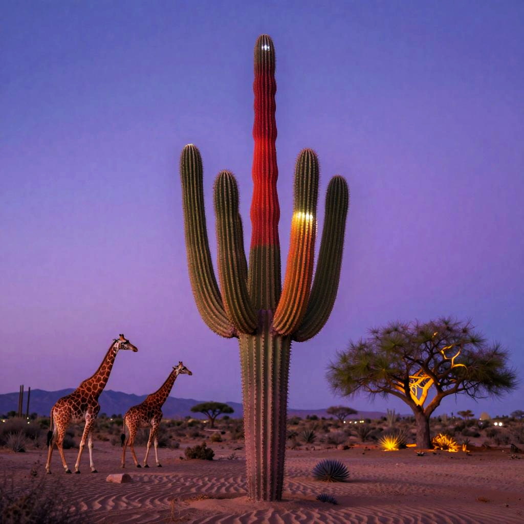 Photorealistic shot of an ancient desert cactus landscape, with golden hour light casting long shadows, highly detailed and sharp focus, in the style of Smithsonian and Lonely Planet, vibrant colors and depth of field in UHD resolution.