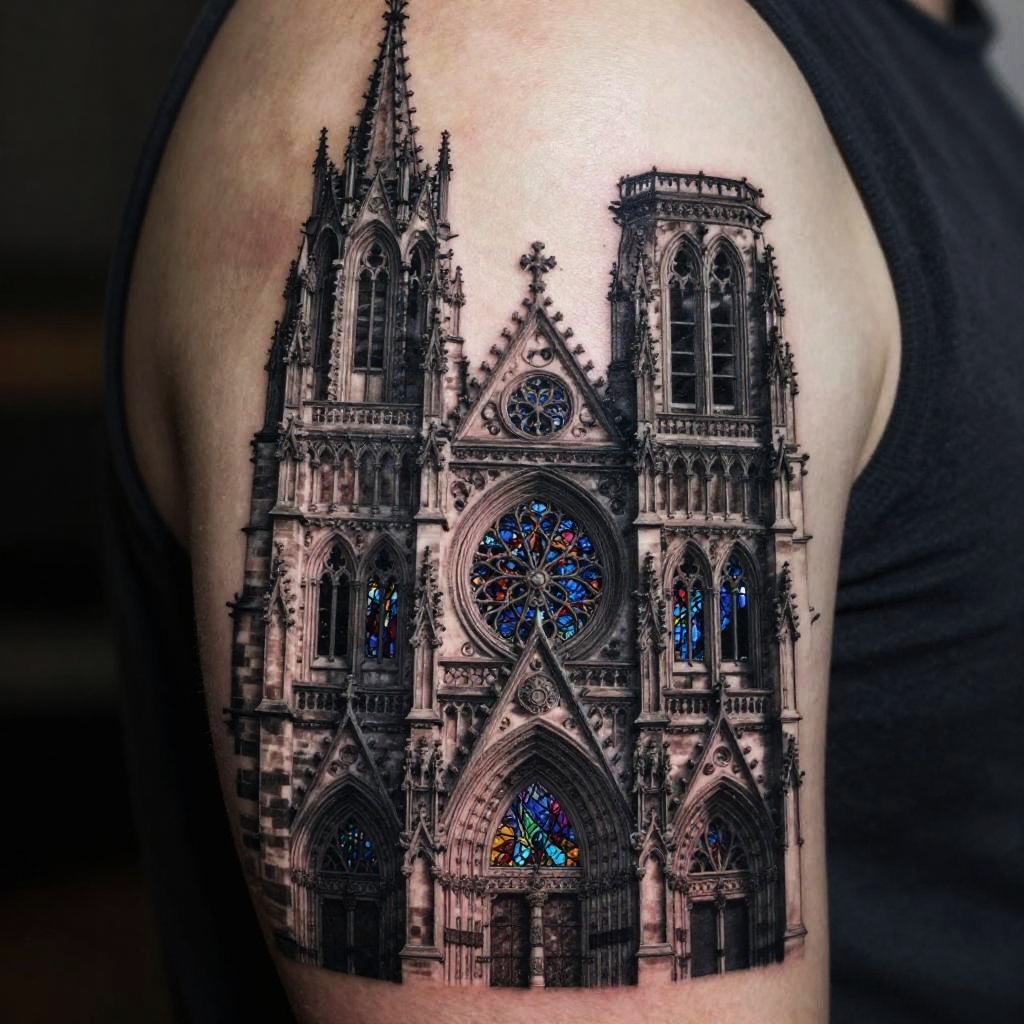 Black and gray tattoo of intricate Gothic cathedral with colorful stained glass windows on a person's upper arm, wearing a black sleeveless shirt. Photorealistic