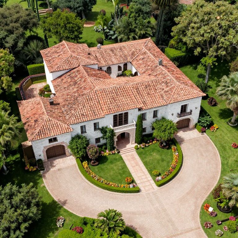 Aerial view showcasing a Spanish Colonial-style mansion with terracotta roofs, surrounded by lush greenery and meticulously landscaped grounds featuring circular driveways, manicured hedges, and vibrant flower beds.