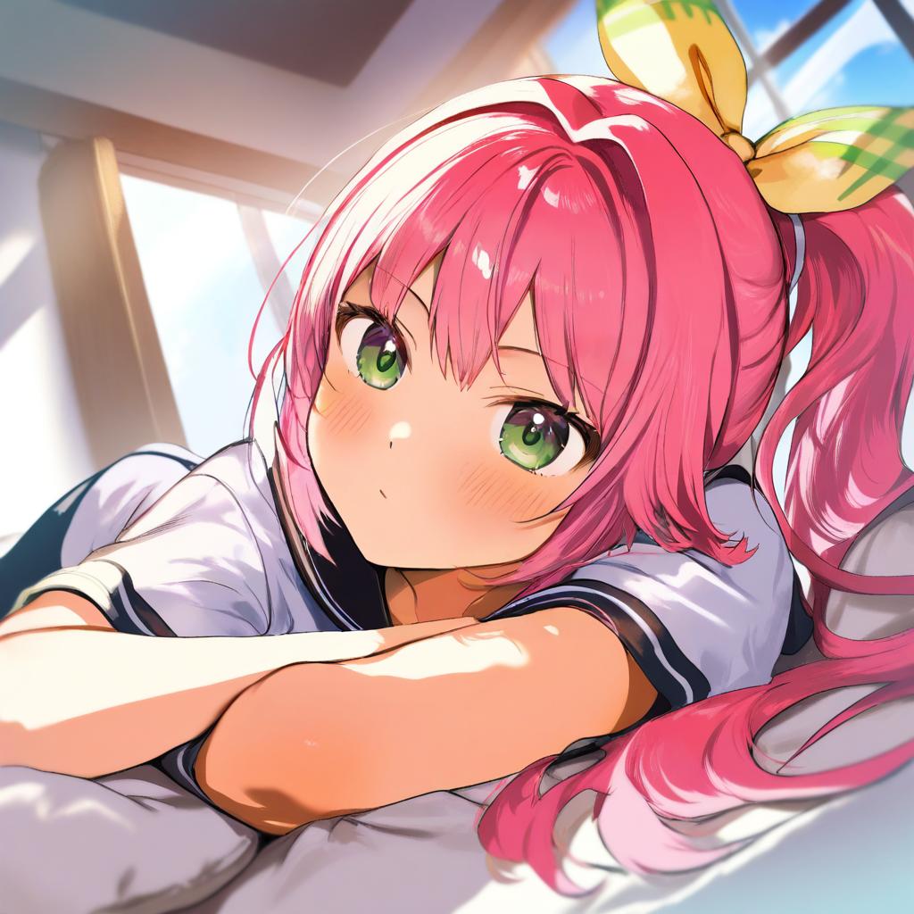 Close-up digital illustration of an anime girl with long pink hair tied in a ponytail with a yellow bow. She has large green eyes and is wearing a white and navy sailor-style school uniform. The setting suggests she is indoors near a window with soft natural light.