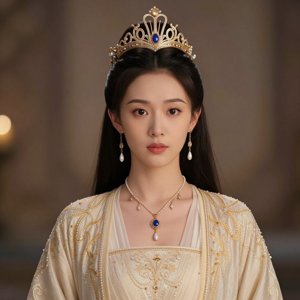 This is a digitally rendered image of an East Asian woman with long, straight black hair, wearing a golden tiara adorned with a blue gemstone. She has fair skin, delicate features, and is dressed in an ornate, cream-colored gown with intricate gold embroidery and beading. She wears matching gold earrings and a necklace with a central blue gemstone. The background is softly blurred, featuring warm, dim lighting that suggests an elegant, indoor setting. The overall style is regal and refined, with a focus on opulent, royal attire and accessories.