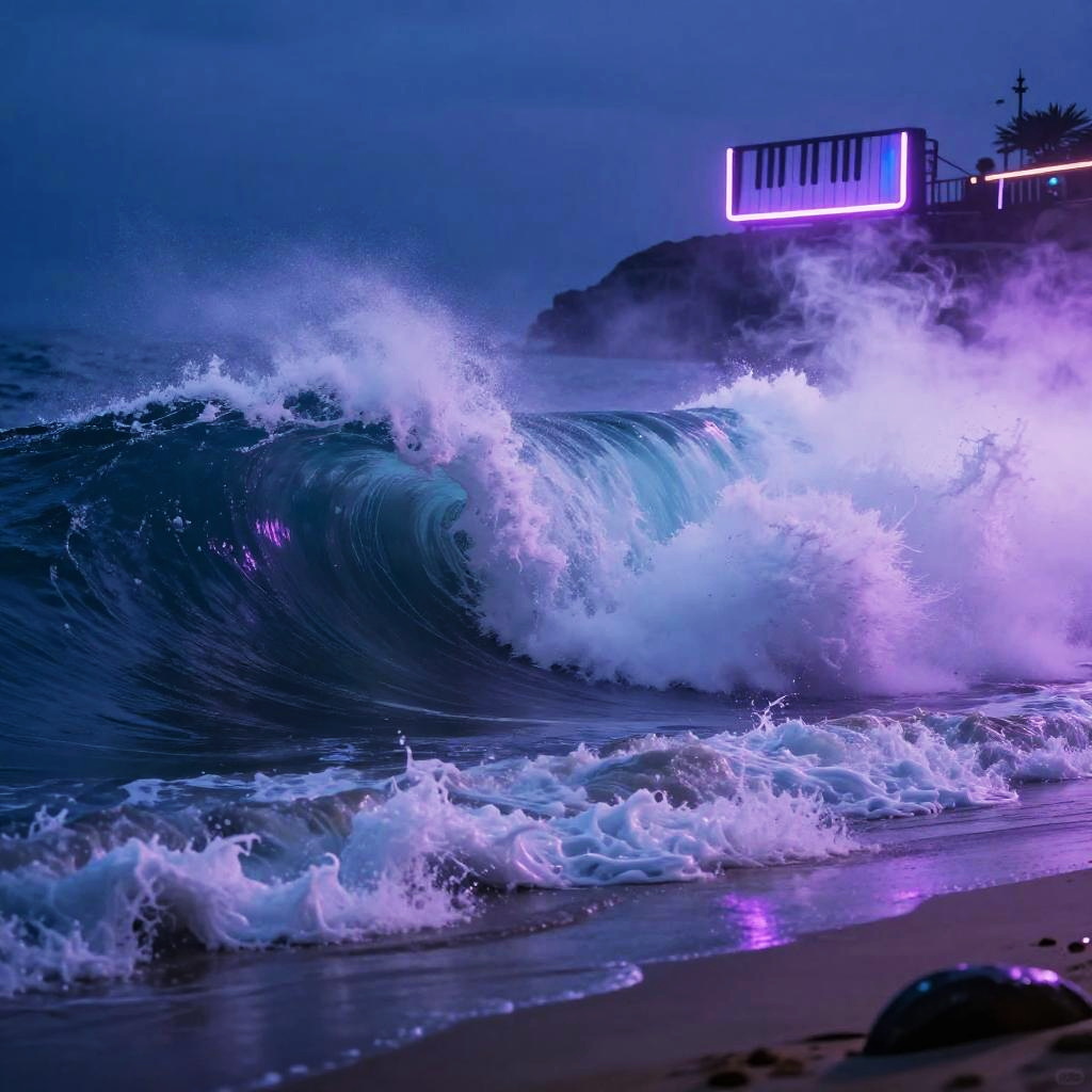 Vape wave, surreal scene with massive vapor waves crashing over a futuristic beach, neon lights, synthwave aesthetic, vibrant purple and blue hues, dreamy atmosphere