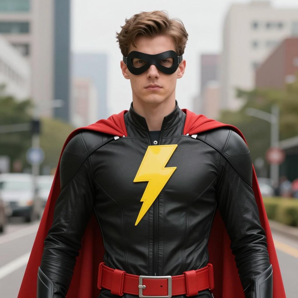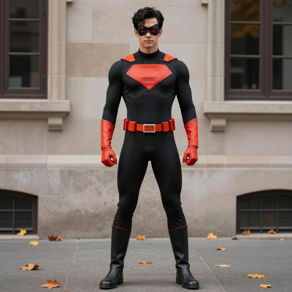 Big hero six fred costume, photograph of a young man, wearing a Marvel's Quicksilver costume, standing against a brick wall, full body, frontal view, short brown hair, glasses, red and black suit with Quicksilver on chest, red and black gloves, black pants with red belt, realistic style, neutral expression, soft lighting, casual pose