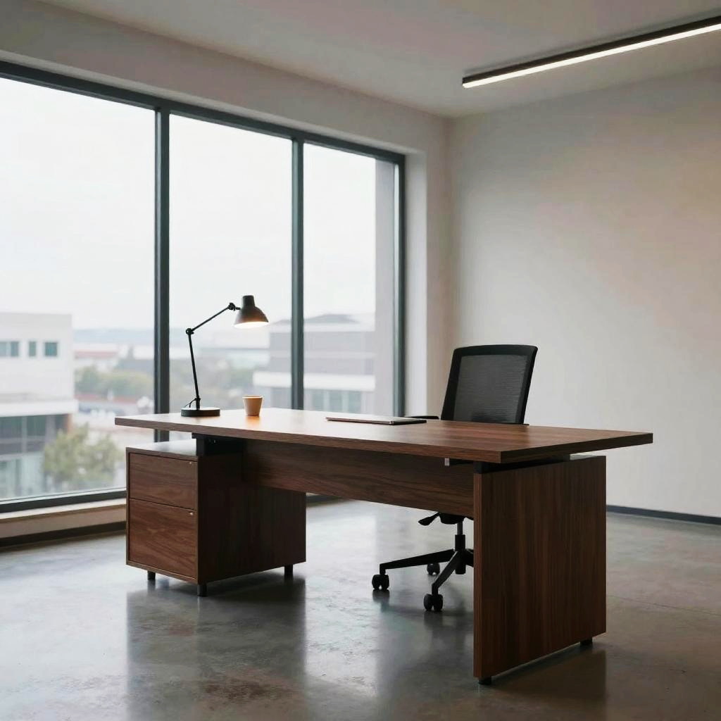 Minimalist modern office setup featuring a dark wooden desk with a metal lamp and a cup. The desk is positioned near large floor-to-ceiling windows with an urban cityscape view. The office chair is black with a mesh back. The room has polished concrete flooring and a linear ceiling light.