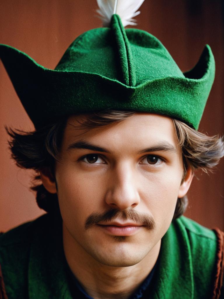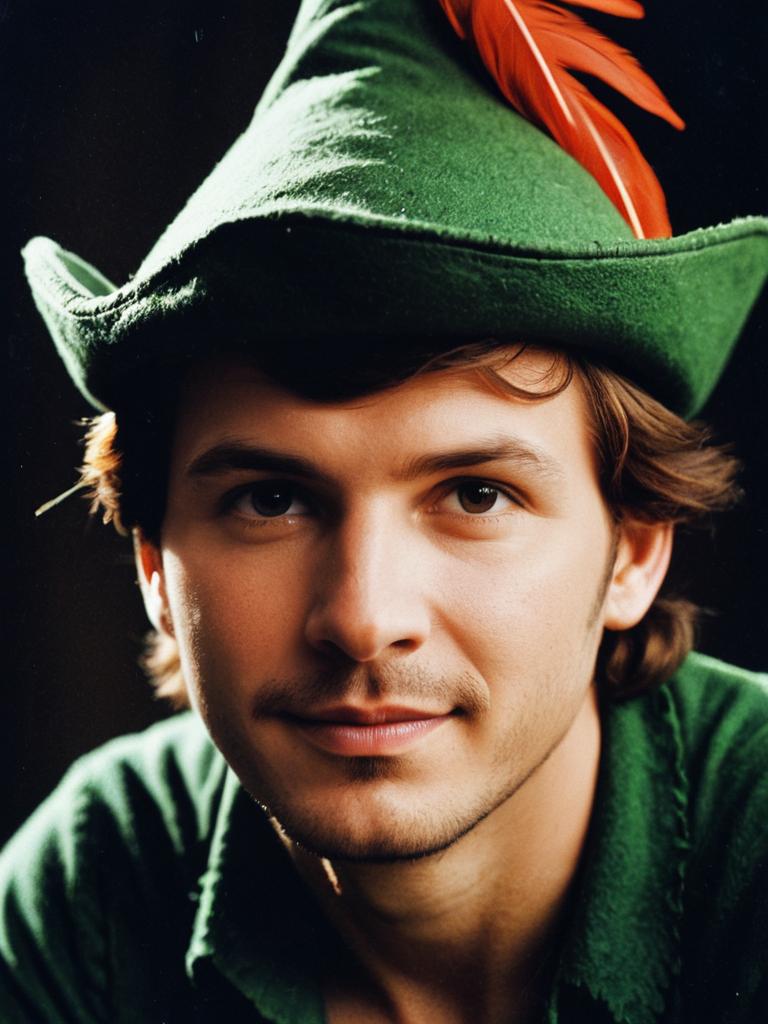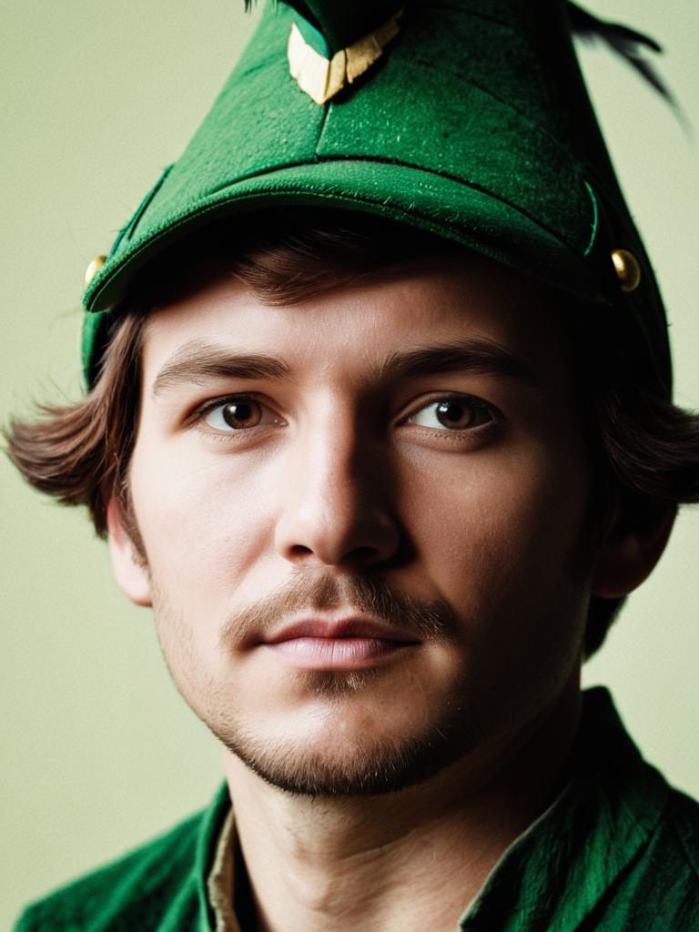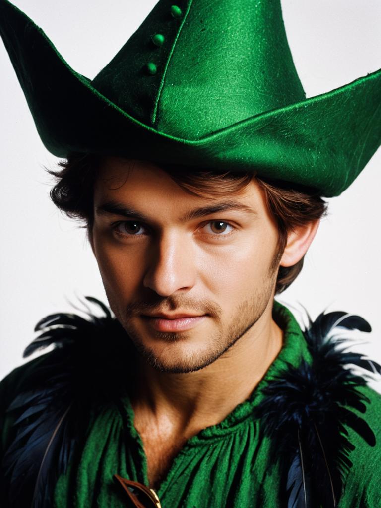 Man in Disney Peter Pan Costume, close-up detailed headshot with feathered cap