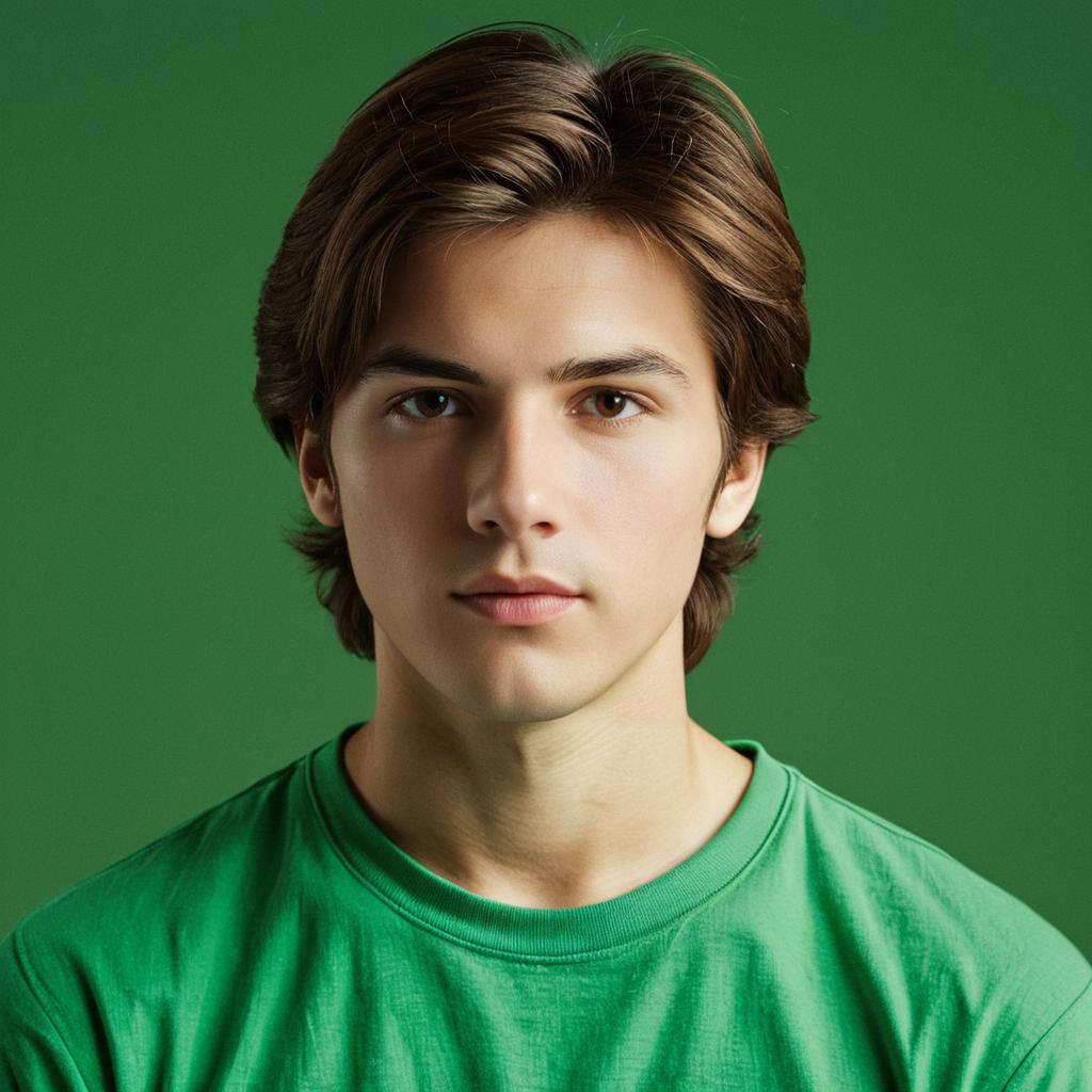 Close-up headshot of a young man wearing a detailed green Peter Pan costume featuring a feathered cap. The man has light skin, brown eyes, and light facial hair, set against a soft green background.