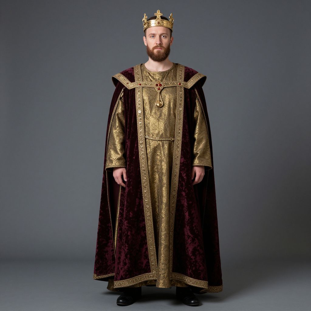 A photograph of a bearded man standing against a gray backdrop. He's wearing a golden crown with intricate details, a long, gold and maroon robe with velvet texture, and black shoes. His expression is neutral, and he's centered in the frame, looking directly at the camera. The robe has a royal, medieval vibe, and the overall look is regal and formal.