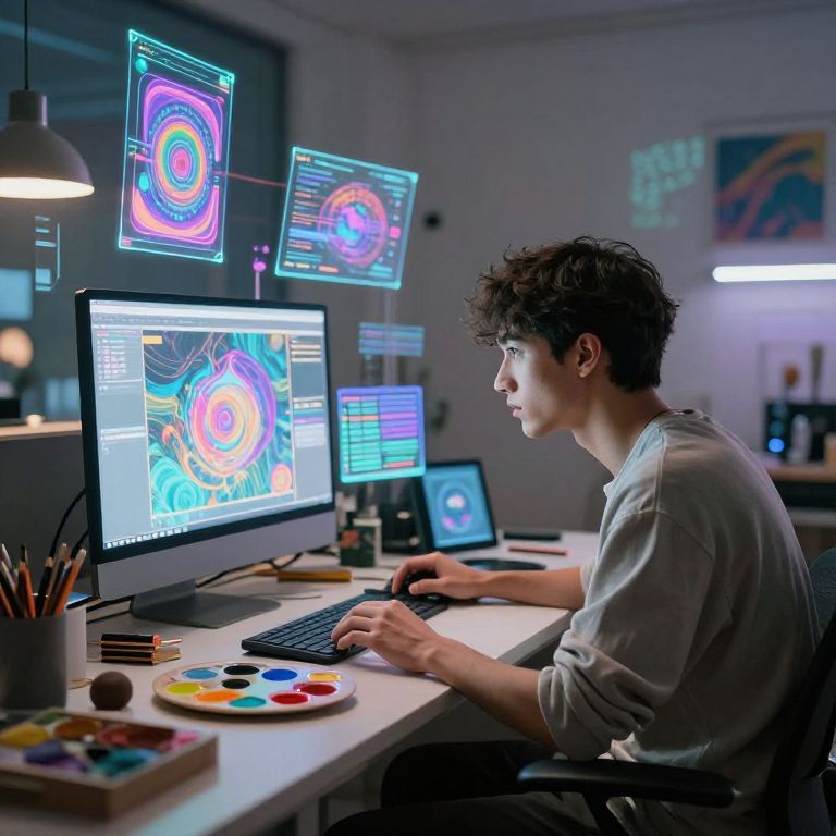 AI artist creating vibrant digital paintings in a futuristic studio filled with holographic screens and glowing neon lights, blending human creativity with advanced technology, detailed and dynamic composition, cyberpunk aesthetics