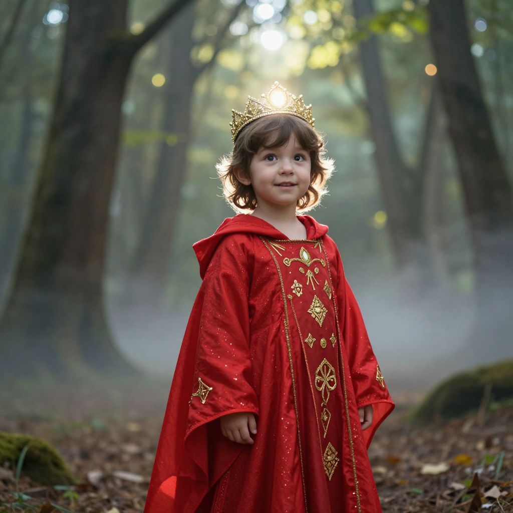 Photograph of a young girl with curly brown hair, wearing a black star-patterned top and silver sequined skirt, standing in a mystical forest with