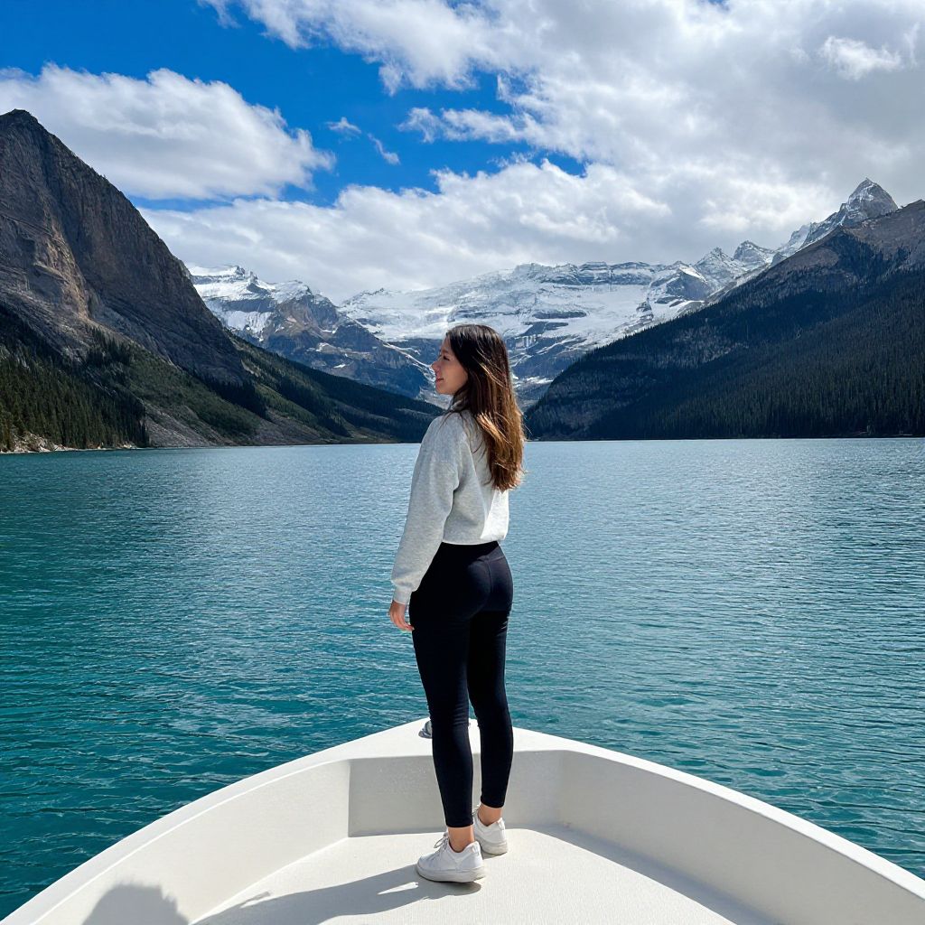 Young woman standing at the bow of a white boat, gazing out over the serene turquoise waters of Lake Minnewanka, framed by majestic snow-capped mountains and a vibrant blue sky dotted with fluffy clouds, embodying moments of happiness and the beauty of nature.