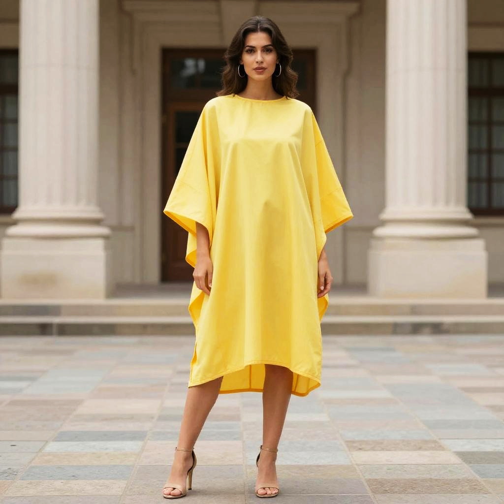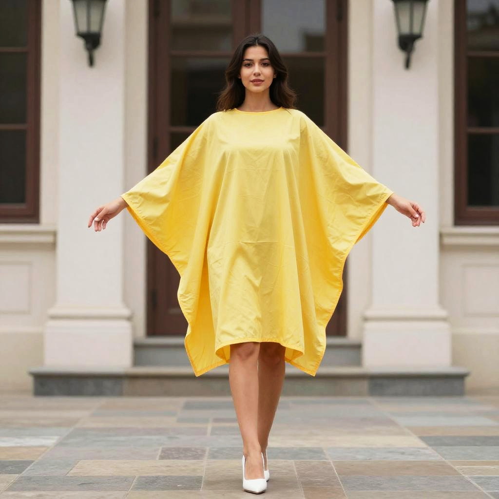 A young woman with medium-length dark hair wearing a bright yellow poncho-style dress standing confidently on a tiled outdoor pathway in front of a building with beige walls and large windows. She is paired with white high-heeled shoes and has a subtle, natural makeup look.