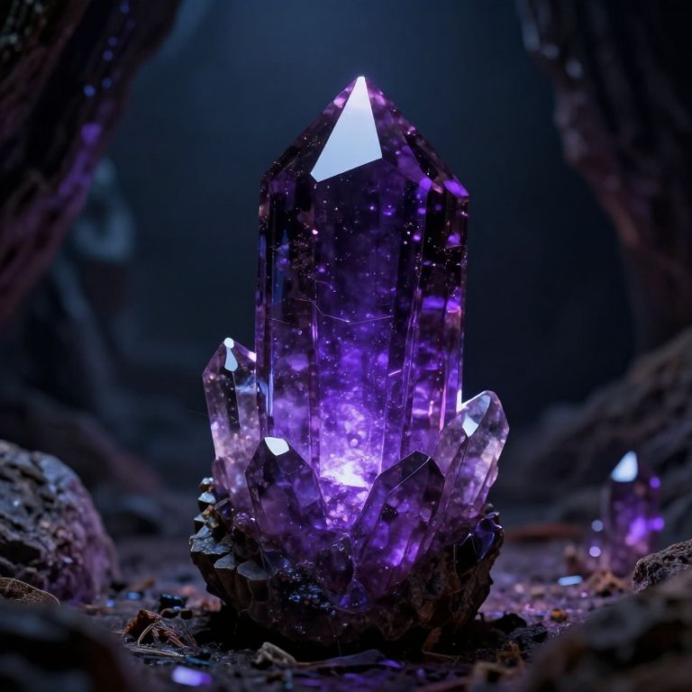 Photograph of a crystal tetrahedron with a faceted, transparent structure, standing in calm water. The crystal emits vibrant, multicolored lights—red, purple, blue, and green—creating a mystical effect. Water ripples surround the crystal, reflecting its colors. The background is a blurred, dark blue forest at dusk, adding a serene atmosphere. The crystal's facets catch the light, highlighting its geometric precision and transparency. The image has a high-contrast, surreal quality, emphasizing the crystal's magical glow against the dark, natural setting.