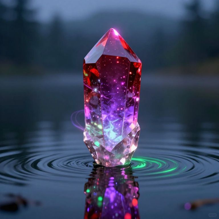 Photorealistic CGI of a glowing, multi-colored crystal standing in calm water, ripples around it, reflecting vibrant reds, purples, and