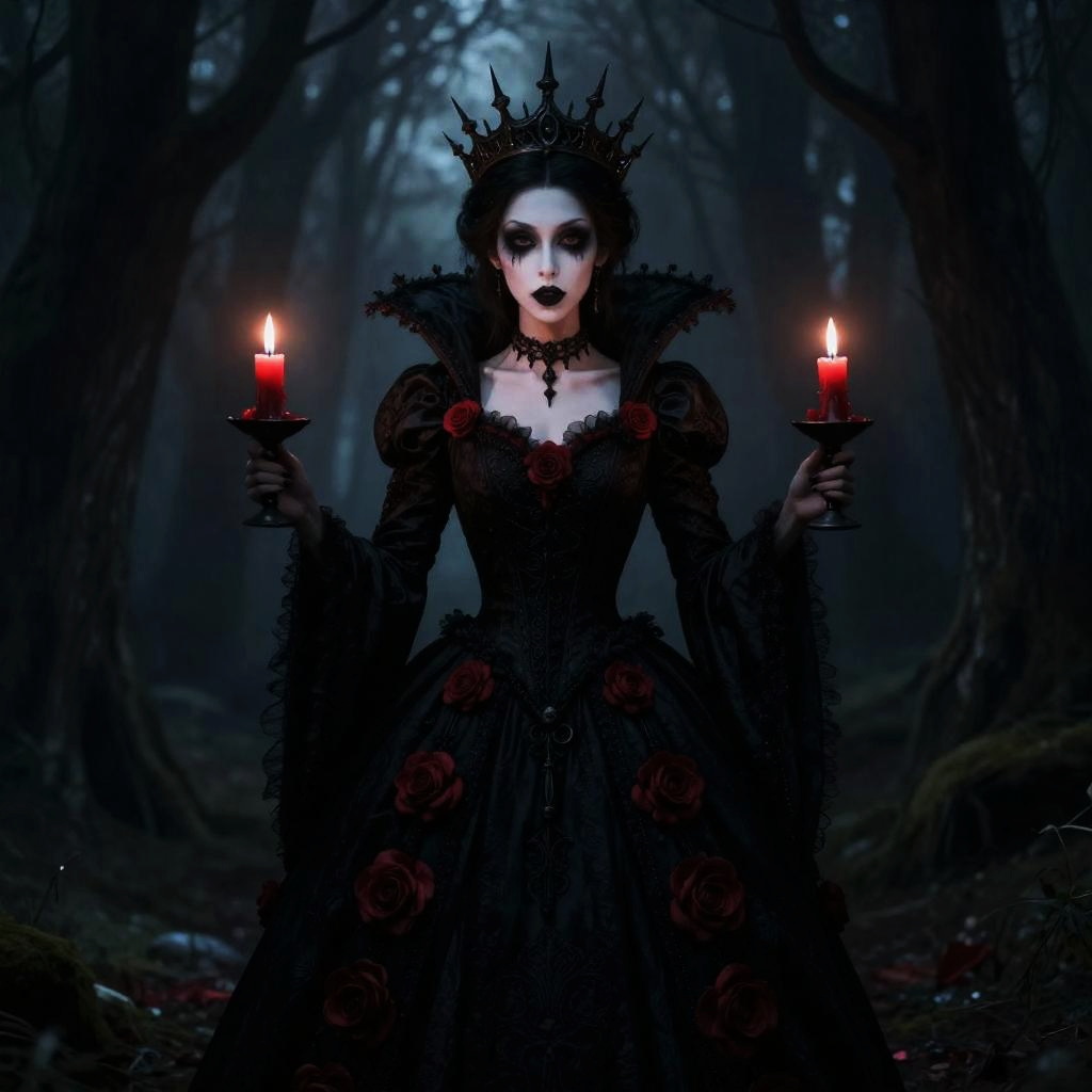 A digital artwork of a gothic queen with pale white skin and striking red lips. She wears a black, ornate crown with red gemstones, a black corseted dress with red accents, and a black fur cloak. Her long black hair flows down her back. She stands in a dark, eerie forest with bare, twisted trees and a glowing full moon in the background. Red candles burn at her sides.