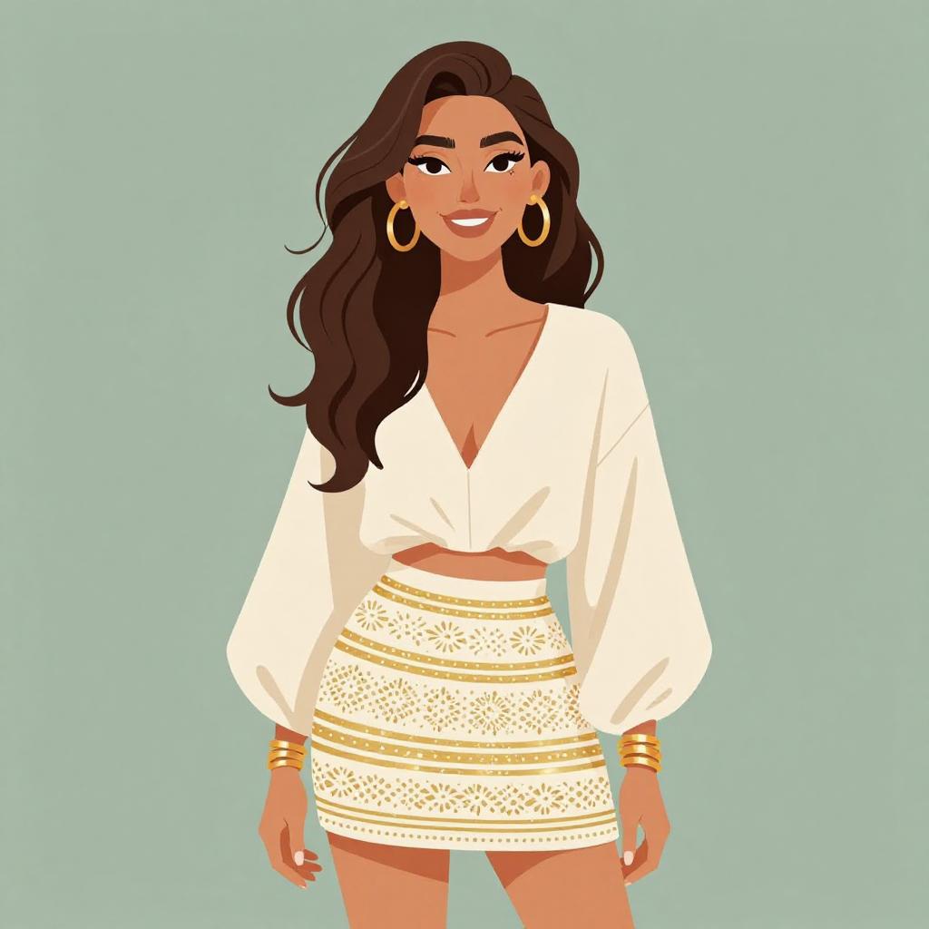 Woman with pretty face and pretty hair. smiling Woman, bohemian, oversized cream blouse with plunging V-neckline, long billowing sleeves, gold cuff bracelets, cream mini skirt with white and gold horizontal stripe pattern and intricate lace embroidery, no visible shoes. --sref 1467