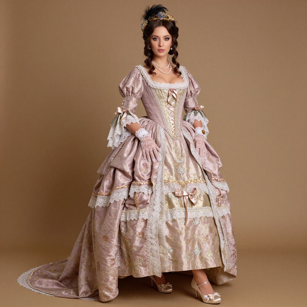 Full body shot, woman, opulent Rococo dress, rich brocade fabric, pastel pink and gold hues, intricate lace trim, puffed sleeves, corseted bodice, flowing skirt with layers, delicate floral embroidery, satin ribbon accents, matching lace gloves, ornate hairpiece with feathers, vintage pearl necklace, elegant silk shoes, baroque-inspired patterns, luxurious silk lining, dramatic train, vintage-inspired makeup, soft curls in hair, regal posture Sexy. Pretty face and beаutiful eyes. Big breasts