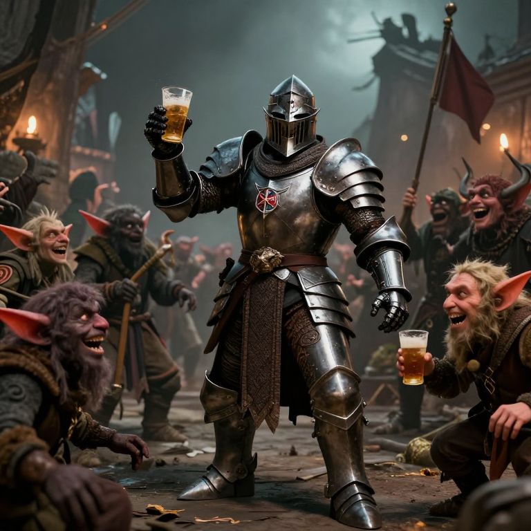Dark Armored Knight Celebrates with Goblins