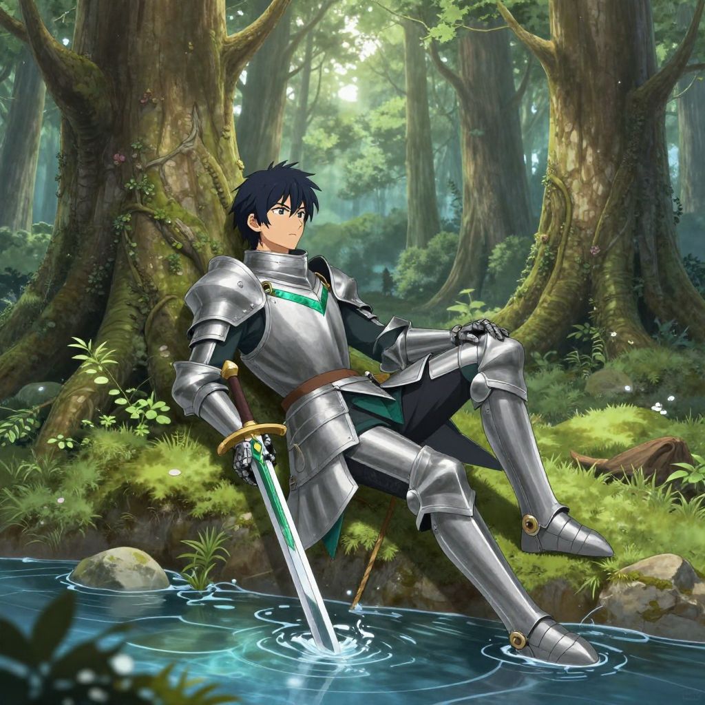 Anime male knight in a lush enchanted forest, resting beside a crystal-clear stream, his gleaming sword planted in the ground, wearing elegant polished armor with emerald details, soft dappled sunlight filtering through tall ancient trees, peaceful and magical vibe.