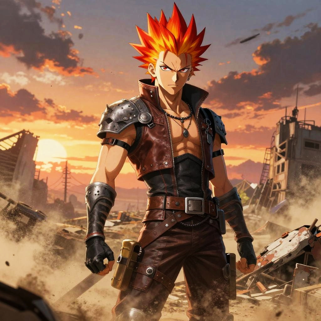 Anime mohawk warrior standing in a post-apocalyptic wasteland, rugged leather outfit, fiery red and orange spiked hair, fierce expression, dust storms swirling around, detailed armor pieces, sunset lighting with dramatic shadows, manga-inspired art.