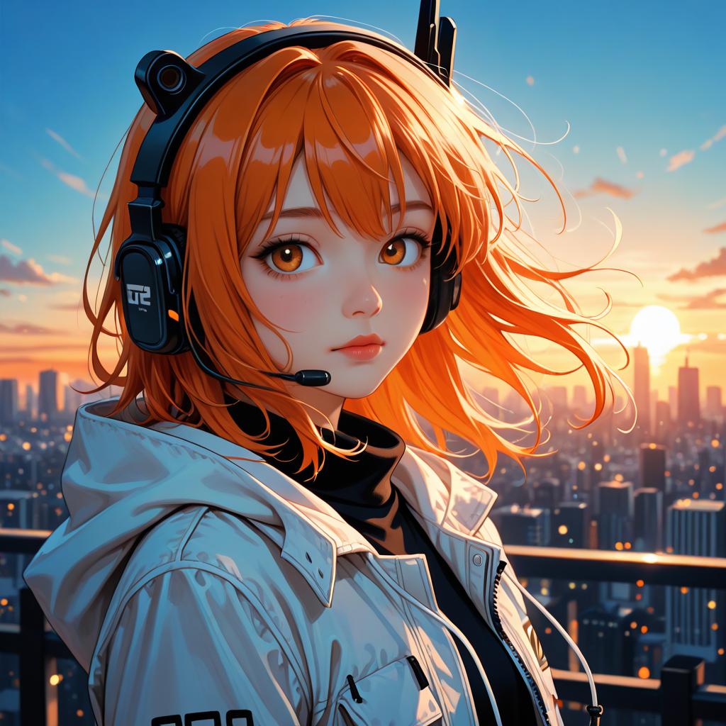 Anime Girl with Headset at Sunset