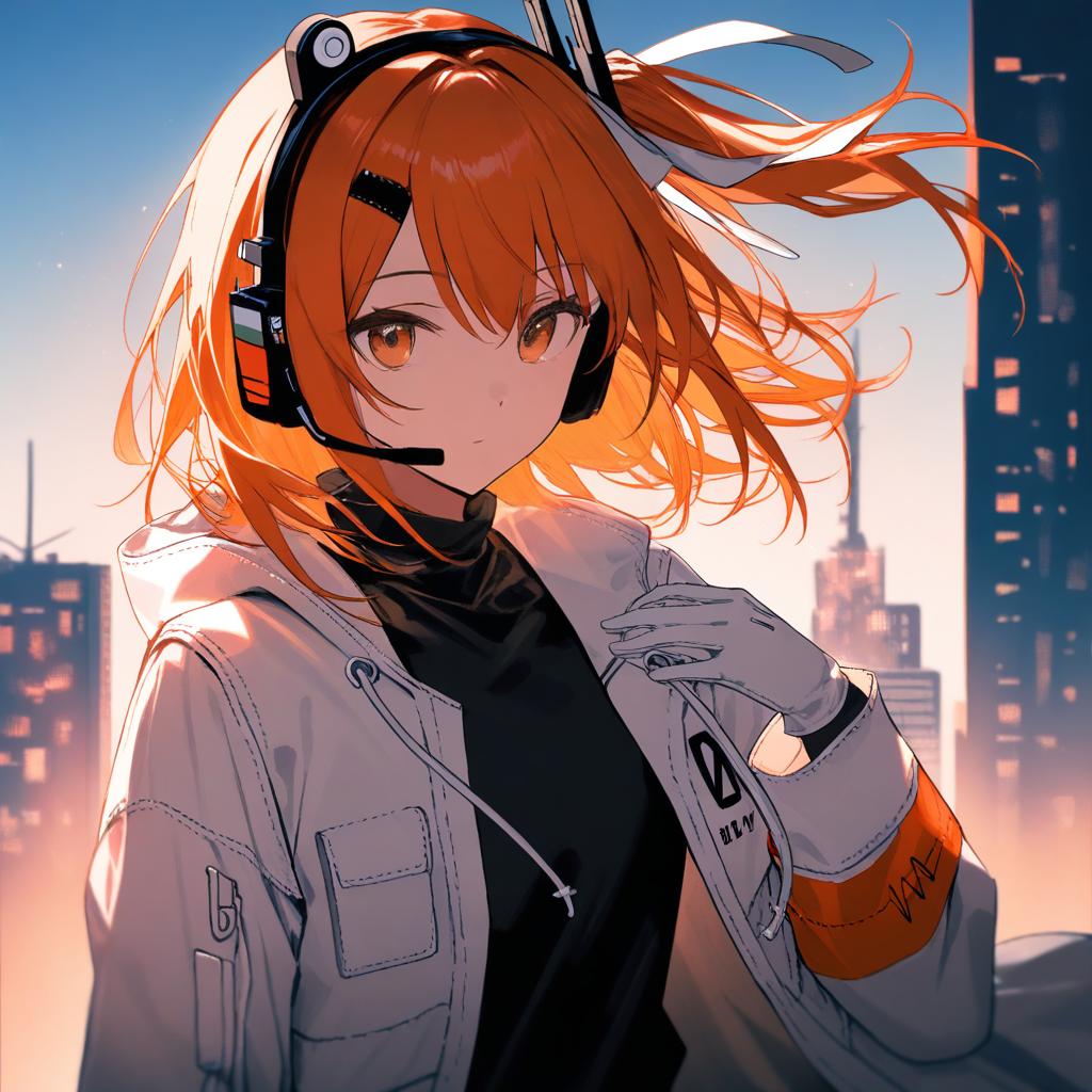Close-up digital illustration of an anime girl with orange hair tied in twin tails, wearing a headset and a white jacket with orange cuffs, standing against a city skyline during sunset. The character has bright brown eyes and a contemplative expression, with a clear blue sky and soft evening light highlighting her figure.
