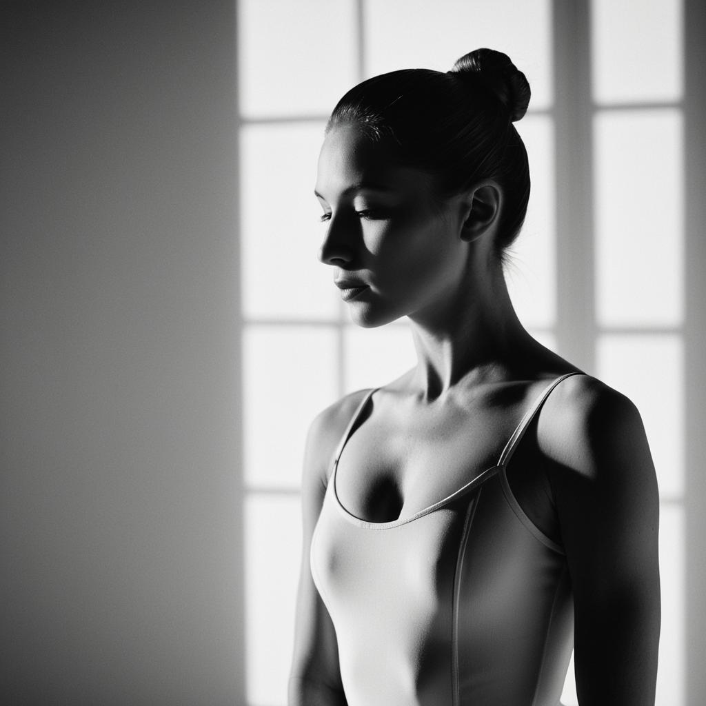 Sleek and Smooth hairstyle on woman, wearing minimal dress, in modern hall, captured in fashion editorial style with cinematic shadows.