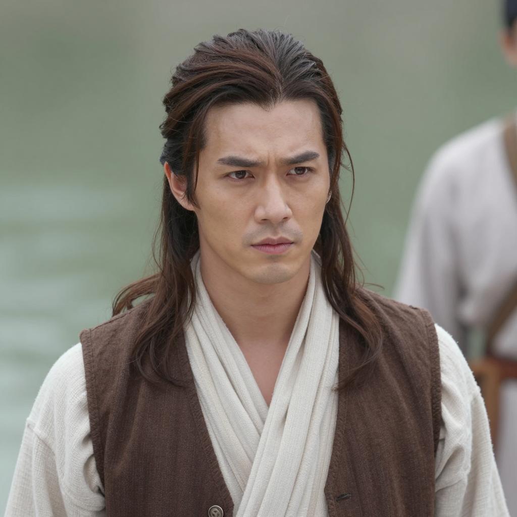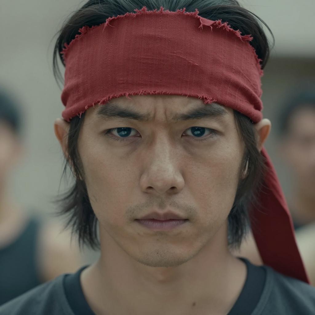 Close-up portrait of a serious young Asian man with medium-length dark hair, wearing a frayed red headband and a dark shirt. The man has intense blue eyes and a focused expression. The background is blurred, emphasizing the subject's face and expression.