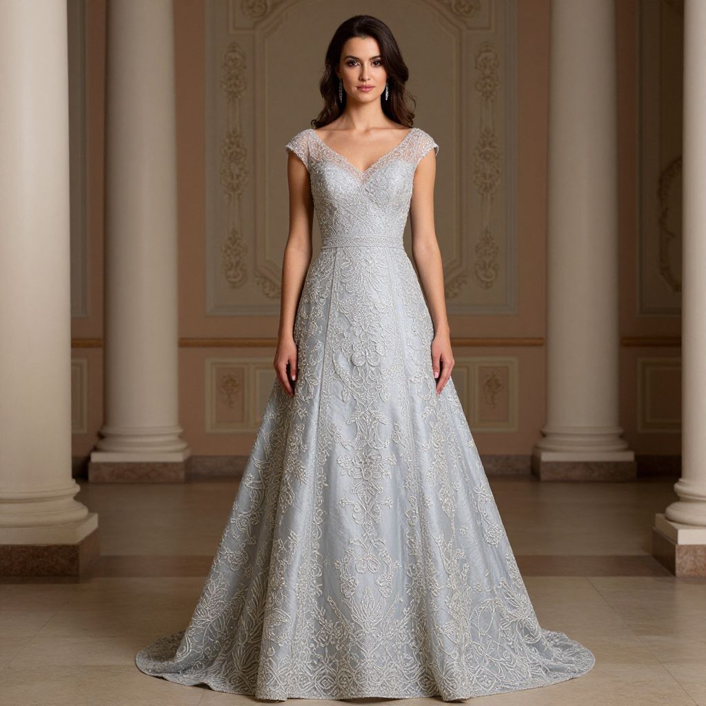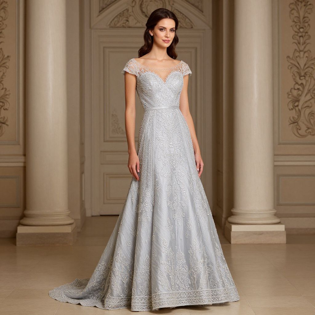 Elegantly poised woman wearing a silver-grey wedding dress adorned with intricate beadwork and floral patterns, standing gracefully in a grand interior with classical columns and ornate walls.