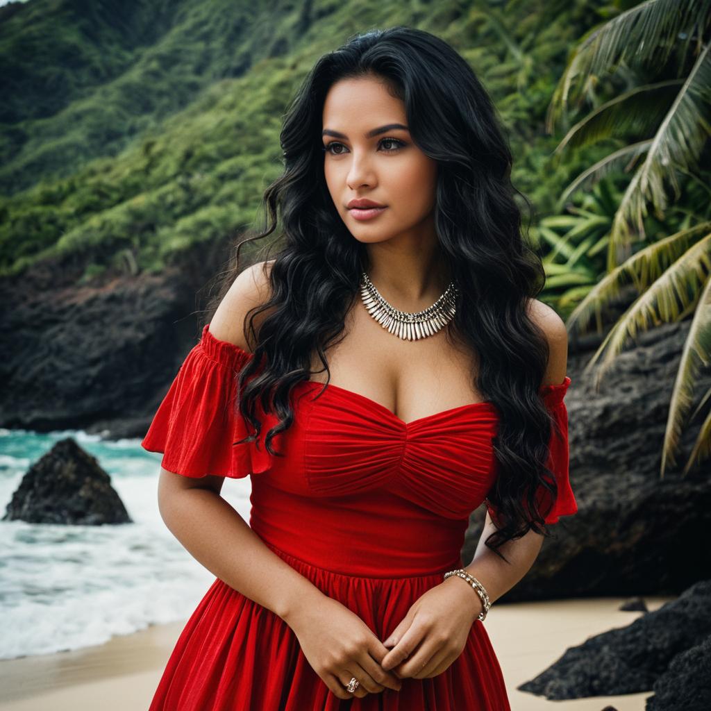 A young woman with long wavy black hair wearing an off-shoulder red dress and a silver statement necklace stands on a tropical beach with green cliffs and palm trees in the background. She looks pensively to the side, accessorized with a bracelet and ring, embodying a natural, elegant beauty in a lush outdoor setting.