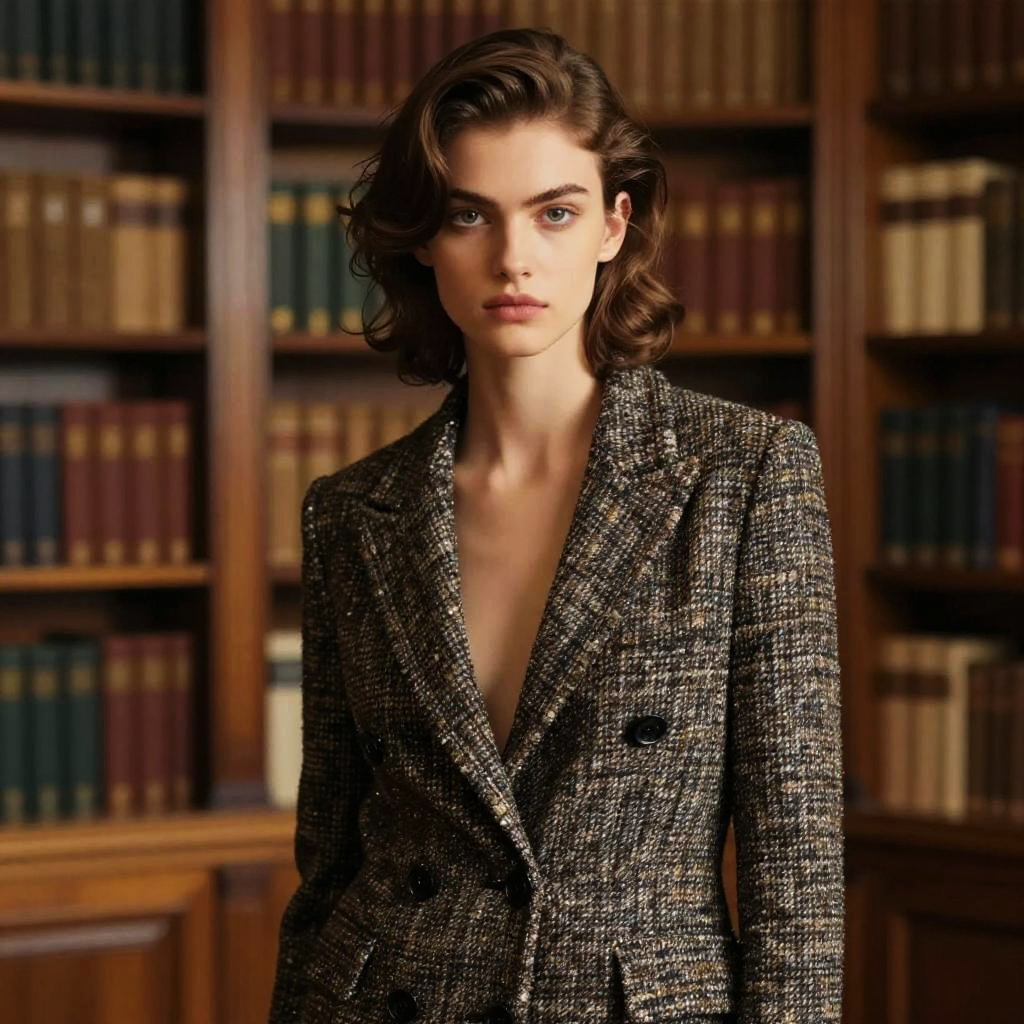 Van Dyke hairstyle on fashion model, wearing tweed blazer, in classic library, captured in fashion editorial style with soft warm light.