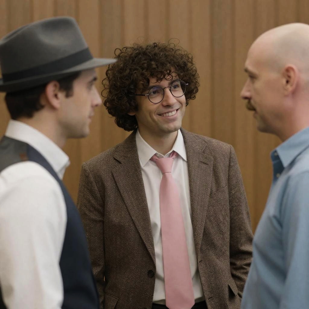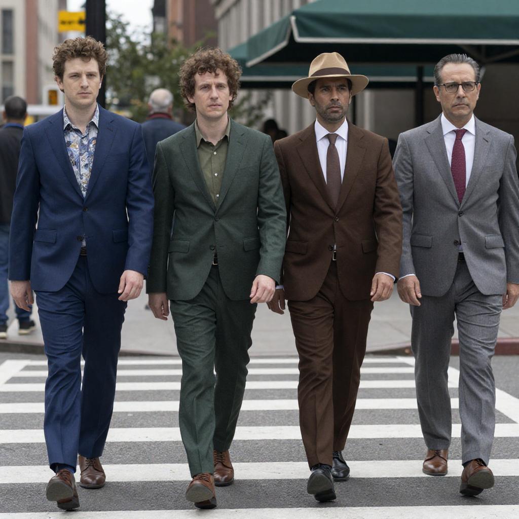 Photograph of four men walking across a city street intersection. First man in blue suit with floral shirt, curly hair, and brown shoes. Second man in green suit with brown shoes, curly hair, and green shirt. Third man in brown suit with tan hat, brown tie, and brown shoes. Fourth man in gray suit with red tie and glasses. Background includes pedestrians, buildings, and a green canopy. All men have serious expressions.