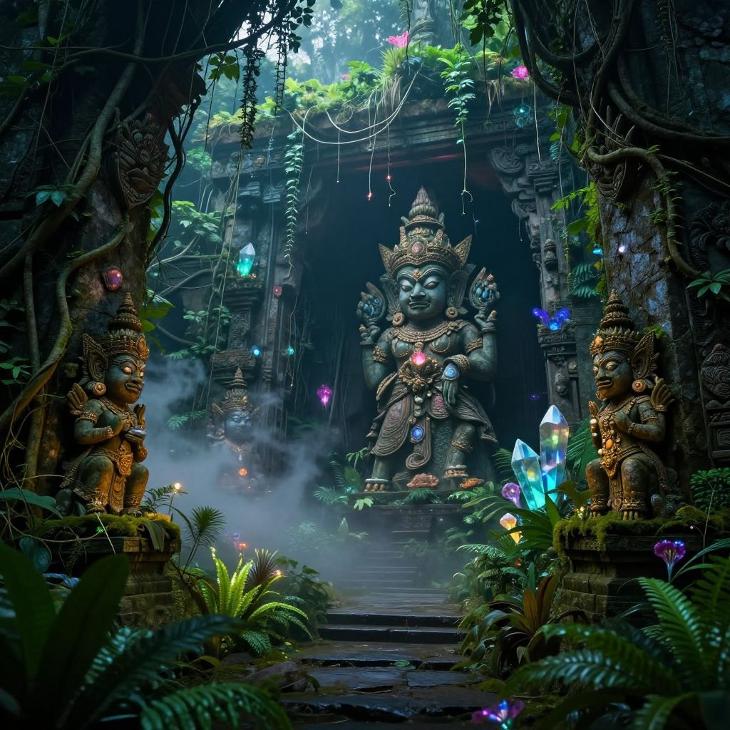 Photograph of a lush, mystical jungle temple featuring a large, ornate stone statue of a Hindu deity with multiple arms, adorned with jewels, standing centrally. Vibrant, glowing crystals in blue, pink, and purple hues are scattered around. Two smaller stone statues flank the deity on either side. Moss-covered stone steps lead up to the central statue, surrounded by dense, green foliage and vines. Soft mist rises, adding an ethereal quality. The dim, ambient light filters through the canopy, highlighting the intricate carvings and colorful crystals. The scene evokes a sense of ancient, sacred mystery and enchantment.