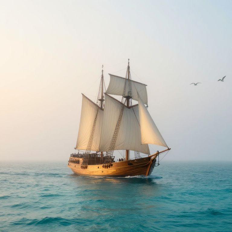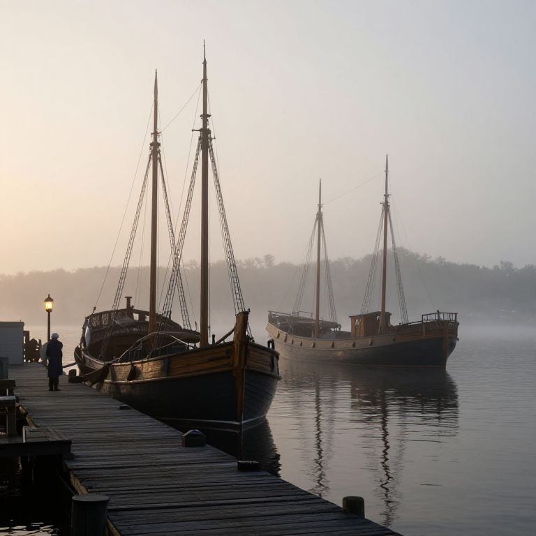 Photograph of two vintage wooden sailing ships moored at a misty, tranquil dock during sunrise, with a lamp post on the left.