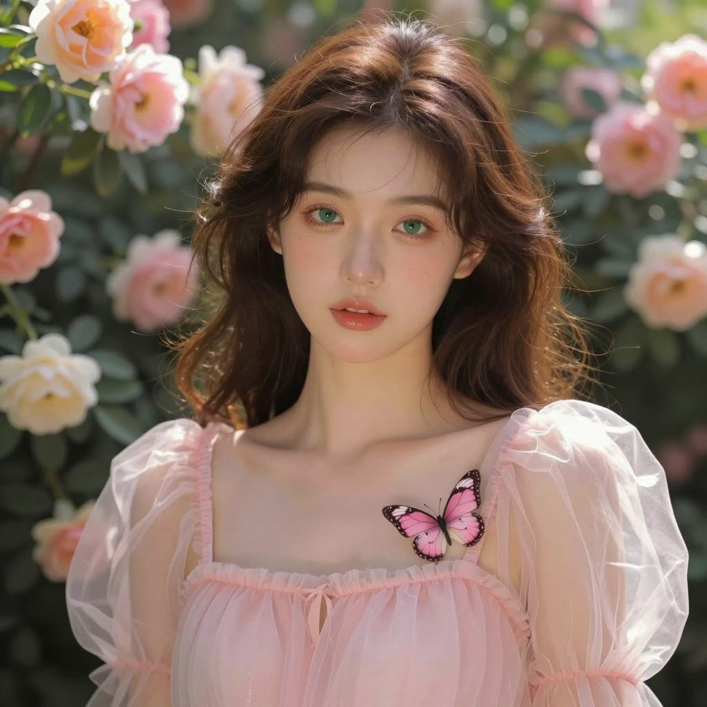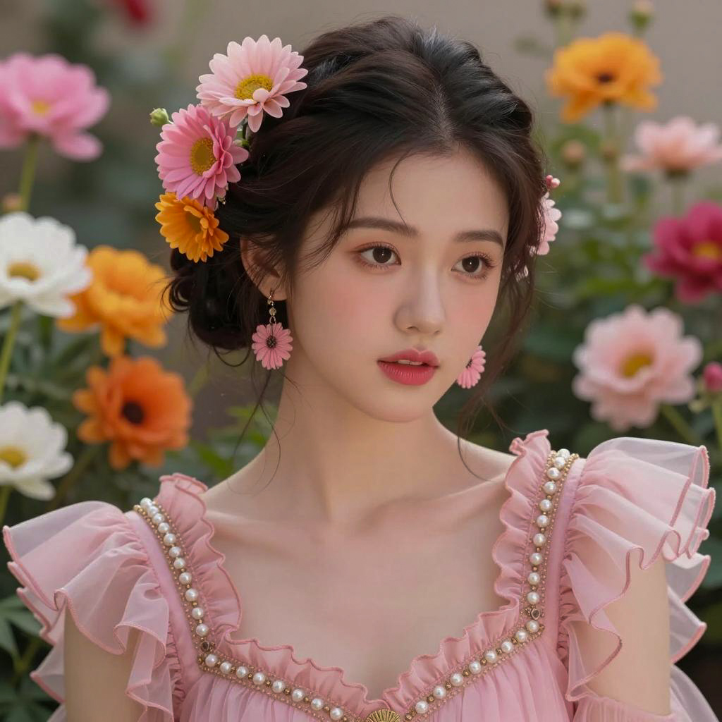 Photograph of a young woman with fair skin and dark hair in an updo, adorned with vibrant pink and orange flowers. She wears a frilled pink dress with beadwork and pink earrings. Her lips are pink, and she looks slightly to the side with a neutral expression. Bright, colorful flowers surround her, filling the background.