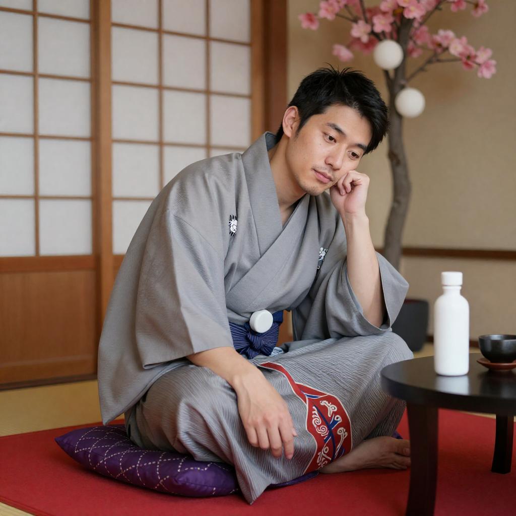 Asian man in gray kimono, sitting on purple patterned pillow, wearing red and blue patterned yukata, resting head on hand. Right side: small round table with white bottle, tea bowl. Background: shoji screen, pink flowers, white orbs. Red carpet. Relaxed pose, slightly dazed expression. Indoor setting.