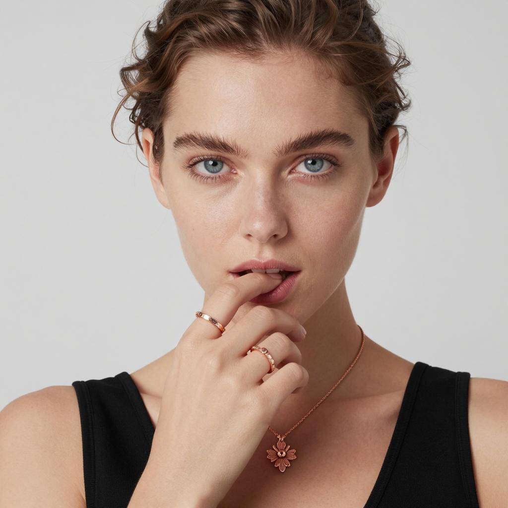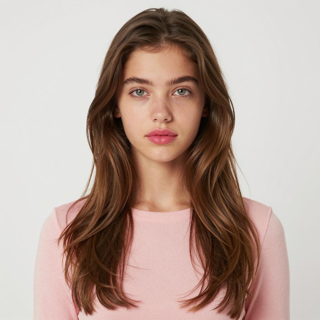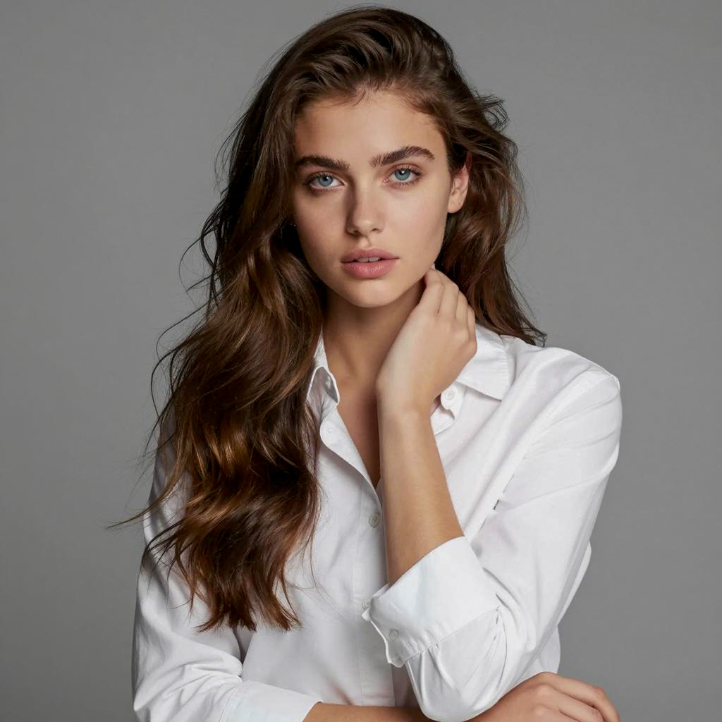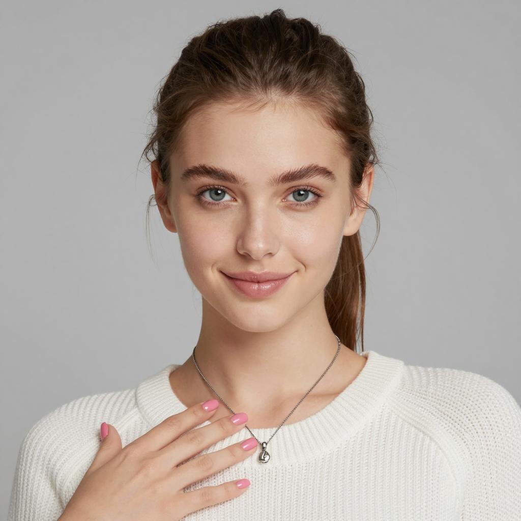Young woman with light skin, brown hair in a ponytail, blue eyes, and full lips, smiling slightly. Wearing a white knitted top, silver necklace with a small pendant. Hand with pink nail polish resting on her chest. Neutral gray background. Close-up portrait.