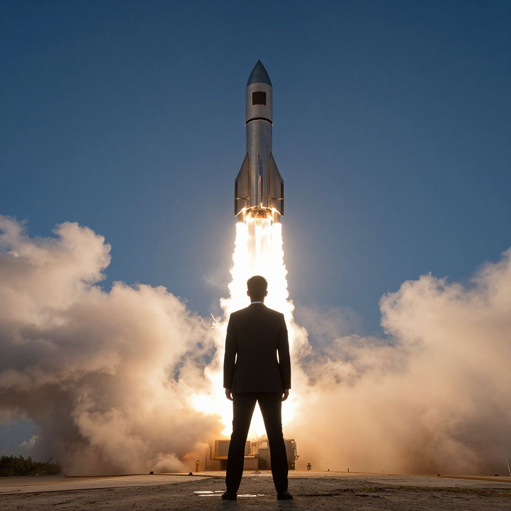 A man in a suit stands in front of a rocket launching into the sky, symbolizing successful business growth.
