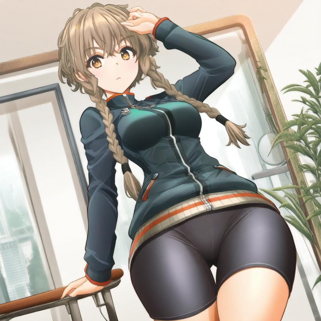 Amane suzuha, steins;gate, 1girl, yellow eyes, green eyes, brown hair, long hair, twin braids, medium breasts, bike shorts, by artist mikeran (mikelan), animagine