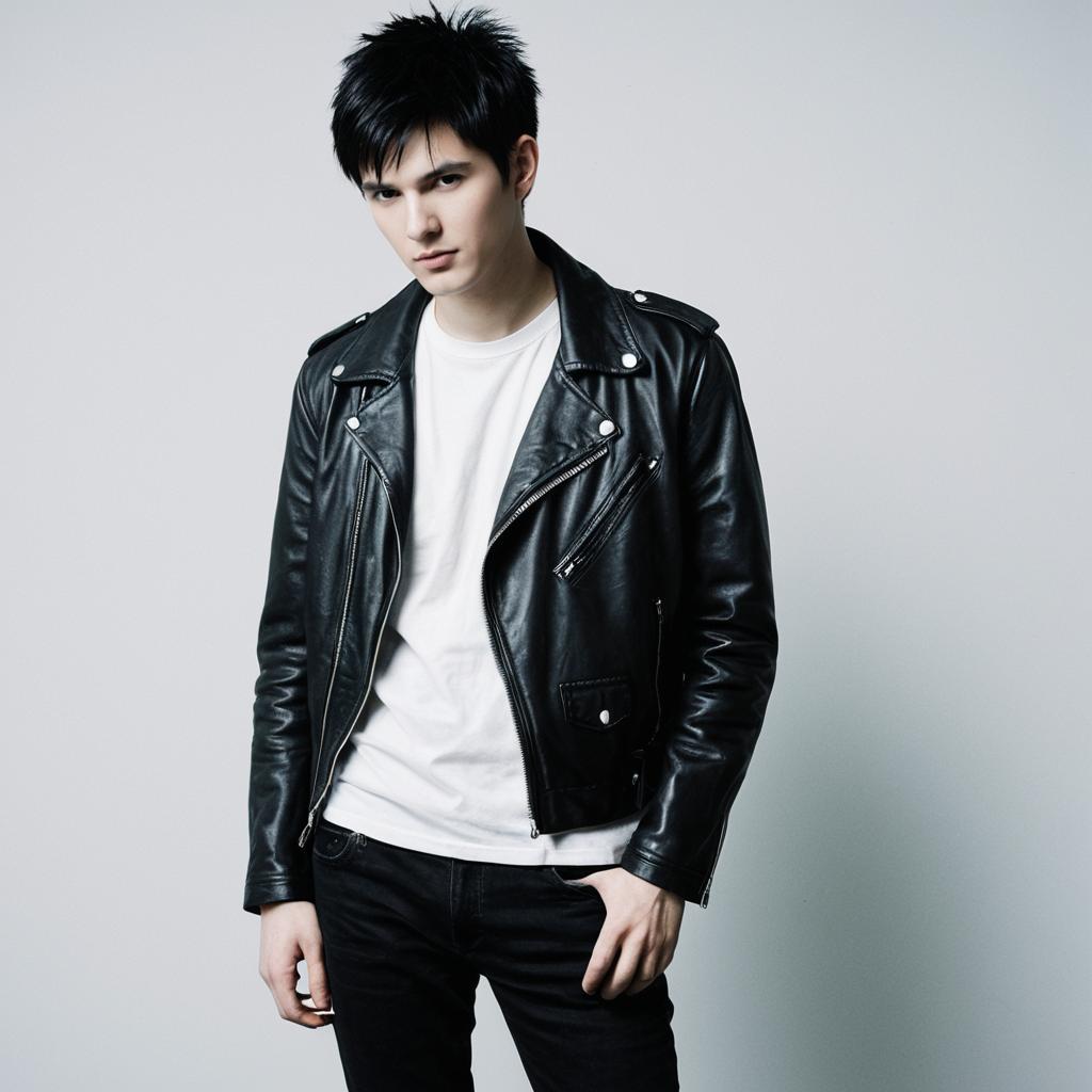 Portrait of a young man with short black hair wearing a black leather jacket over a white T-shirt with text, paired with black jeans. The photo is taken against a plain, minimalistic light gray background.