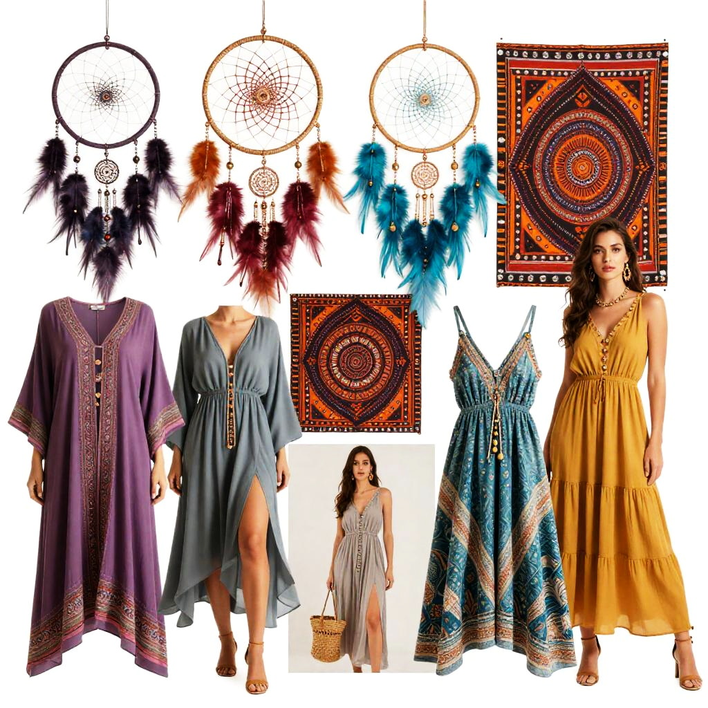 Realistic photo.Stylish moodboard collage with a bohemian theme, featuring flowy fabrics and layered accessories. The background includes dreamcatchers and ethnic prints to add a natural touch. The color palette is bold and colorful, with a high-fashion editorial style. Layered images create a cohesive and visually captivating moodboard, blending vibrant colors with carefully curated fashion elements for an inspiring, trend-focused design. realistic photo