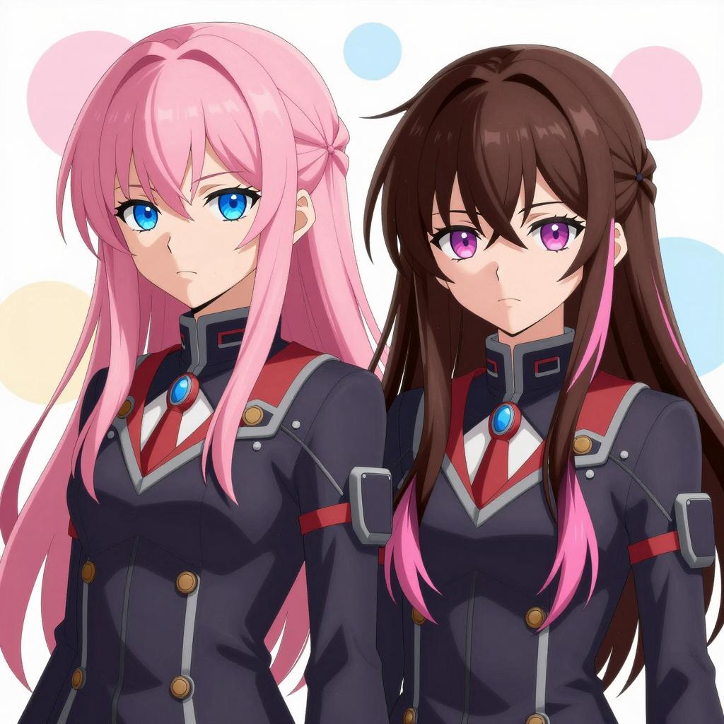 Digital anime-style illustration featuring two characters with striking two-tone hair, combining pink and natural colors. Both have blue eyes and wear matching futuristic school uniforms inspired by Asticassia, characterized by dark tones with red and gray accents. One character has a mole under their eye, long pink and black hair, and a serious expression, while the other has long brown and pink hair and a similar intense gaze. The background includes pastel-colored circles, enhancing the vibrant, stylized aesthetic.
