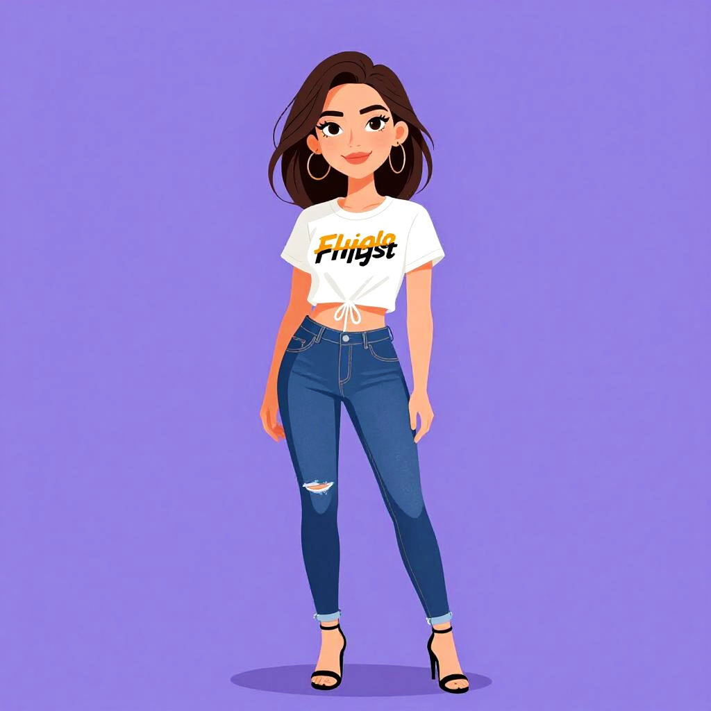 Digital illustration of a young woman with light brown skin and long dark brown hair, wearing a white crop top with "Famous" in yellow and black text, and blue ripped skinny jeans. She has large hoop earrings and black high-heeled sandals. She stands against a solid lavender background with a slight shadow beneath her. Her expression is confident, with a slight smile. The style is colorful, cartoonish, and modern.