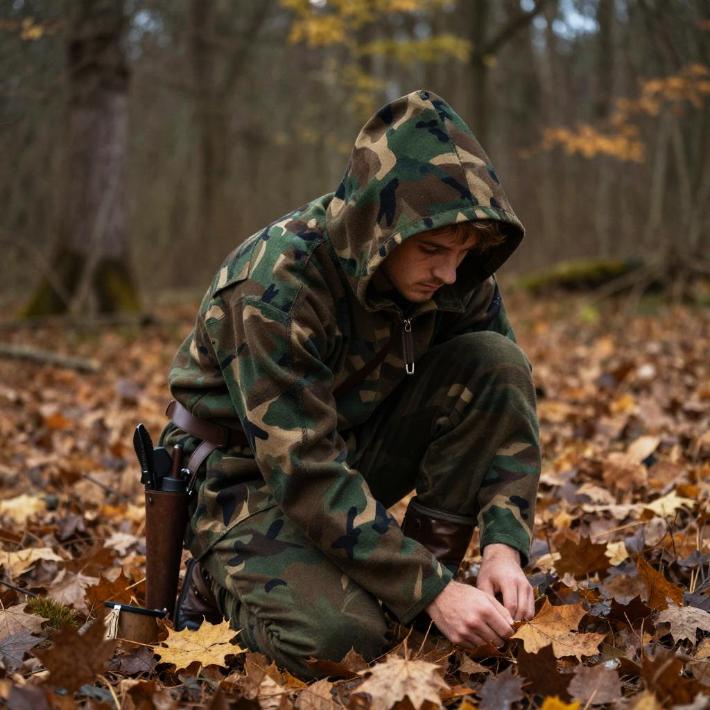 Medieval camouflage outfit for a scout hidden among autumn leaves, with textured cloth and natural colors, soft sunlight filtering through trees, photorealistic detail