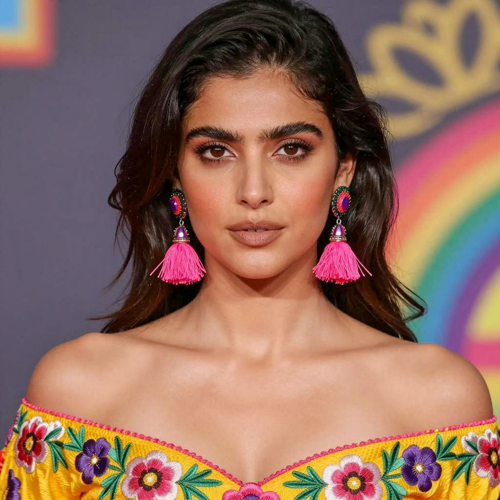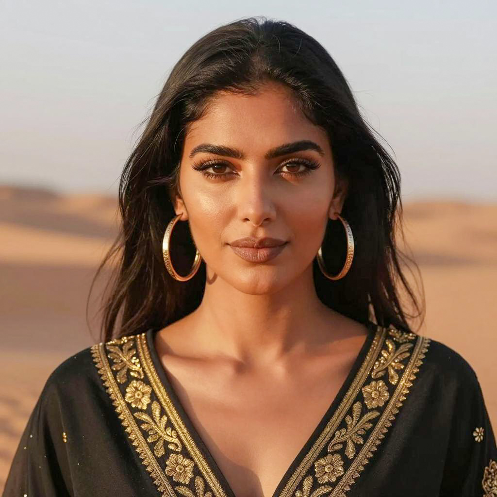 Photograph of a woman with long, wavy brown hair, holding a halved pomegranate close to her face. She has light brown skin, dark eyeliner, and pink lipstick. She wears multiple rings on her fingers, a gold wristwatch, and dangling earrings. The background is blurred with warm tones. She gazes directly at the camera with a slight smile. The pomegranate's seeds are visible inside the fruit.