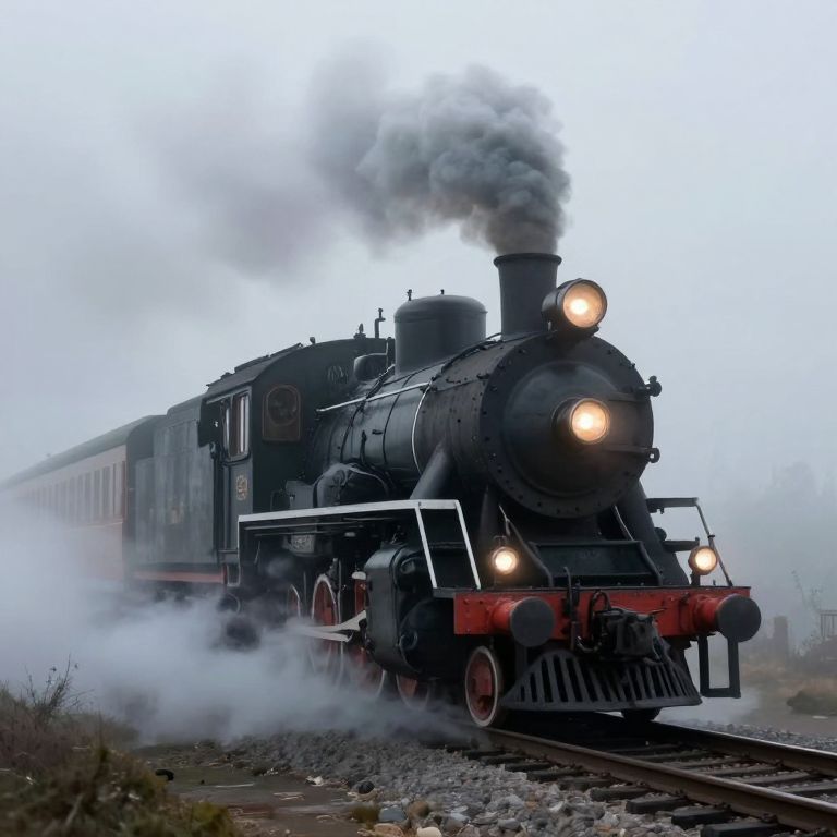 Photograph of a vintage black steam locomotive with red accents and white trim, emitting thick white smoke from its chimney. The front lights are on, illuminating the foggy, overcast sky. The train has a series of maroon passenger cars behind it. The engine is on a set of railway tracks, surrounded by gravel and sparse vegetation. The scene conveys a nostalgic, historical atmosphere with muted colors and a sense of motion as the train moves forward.