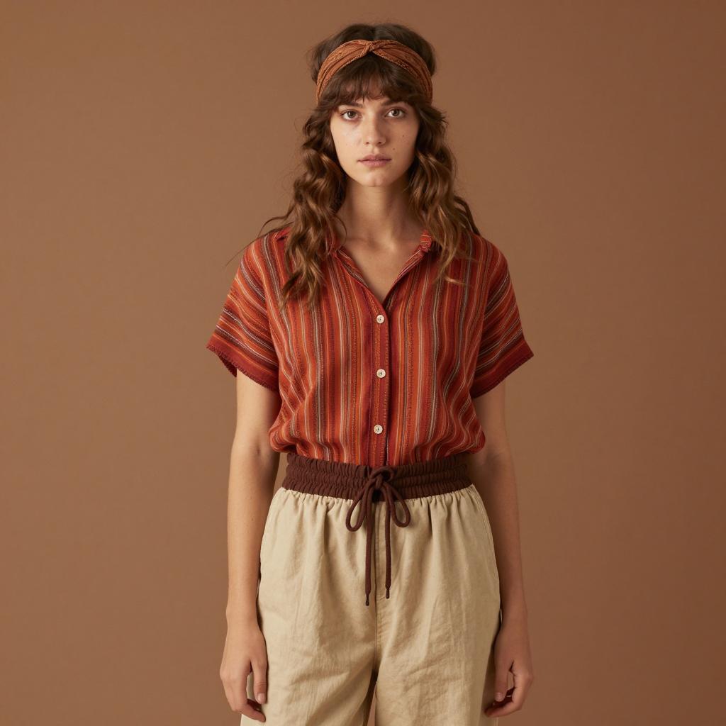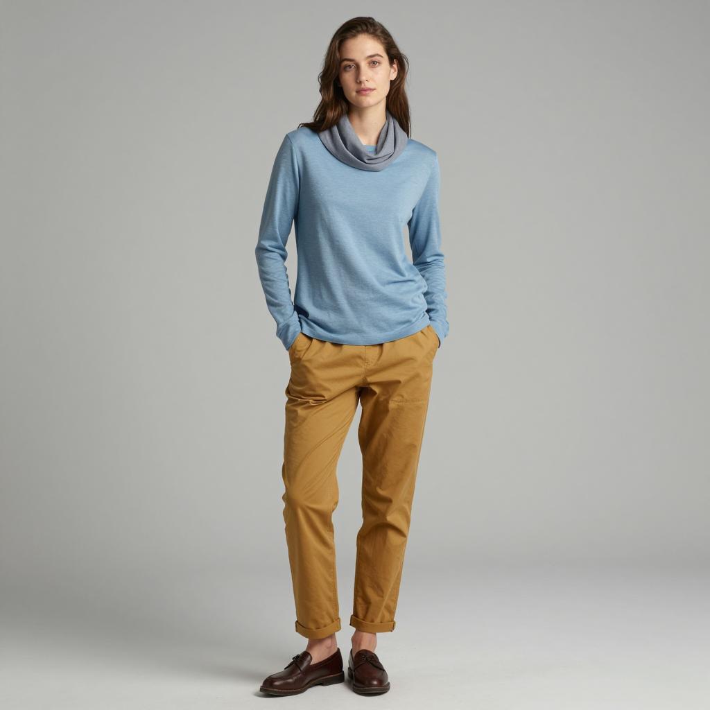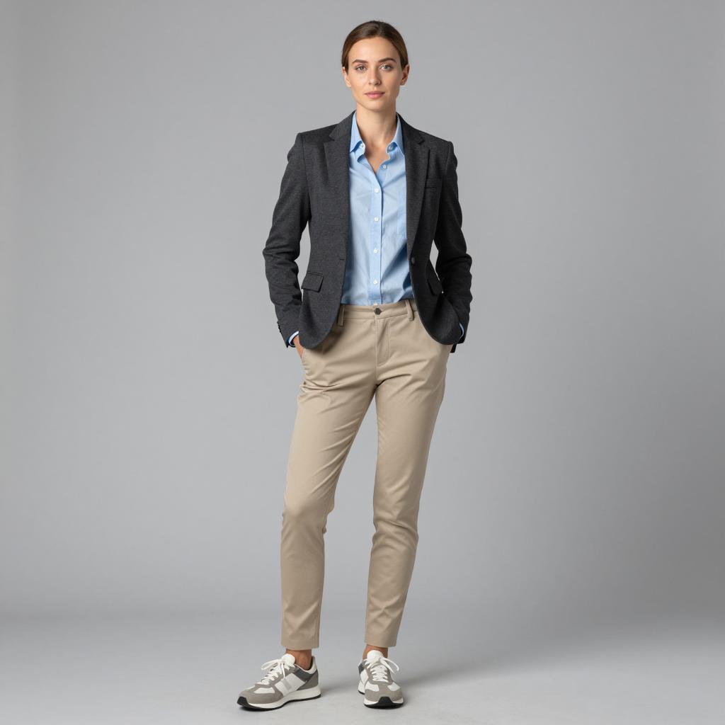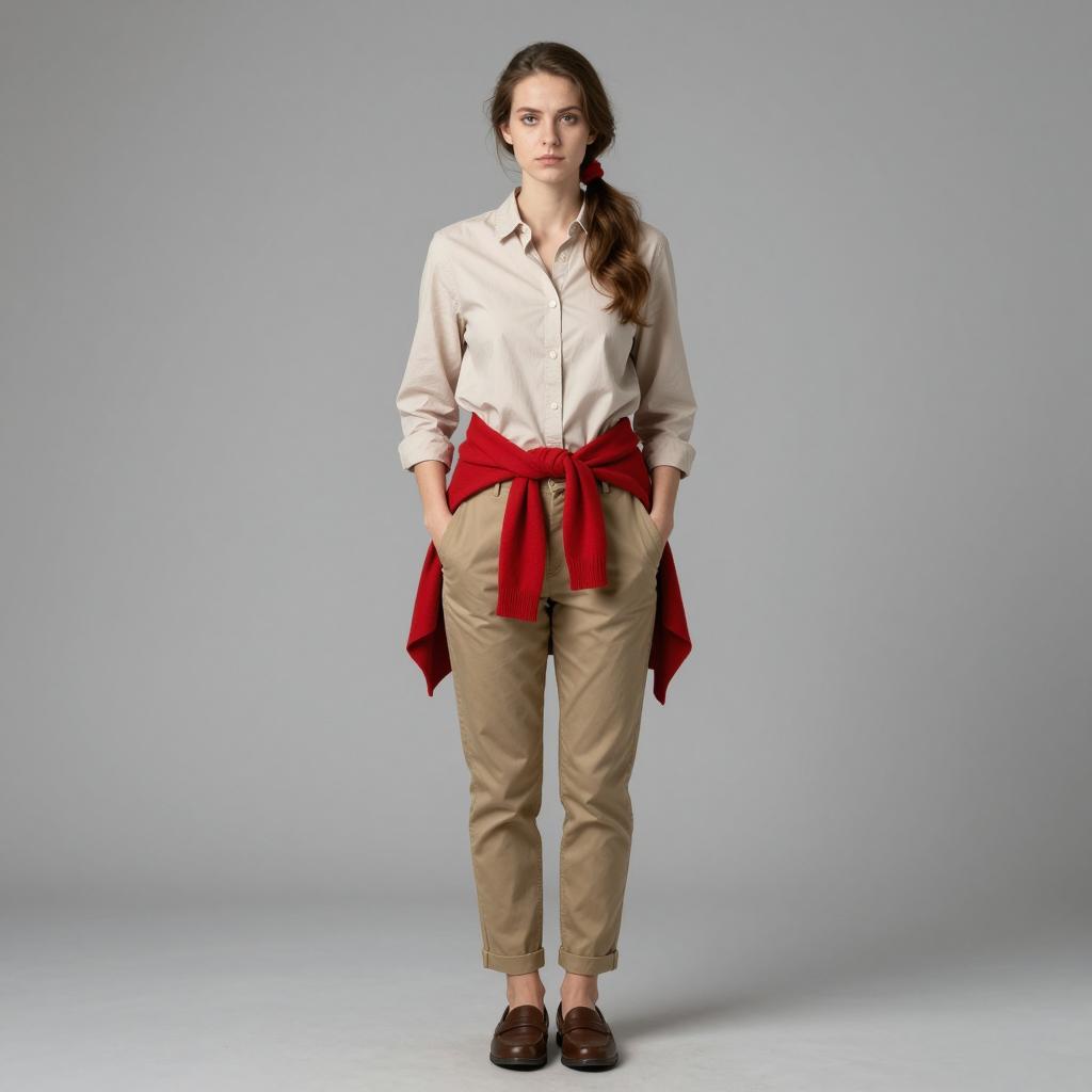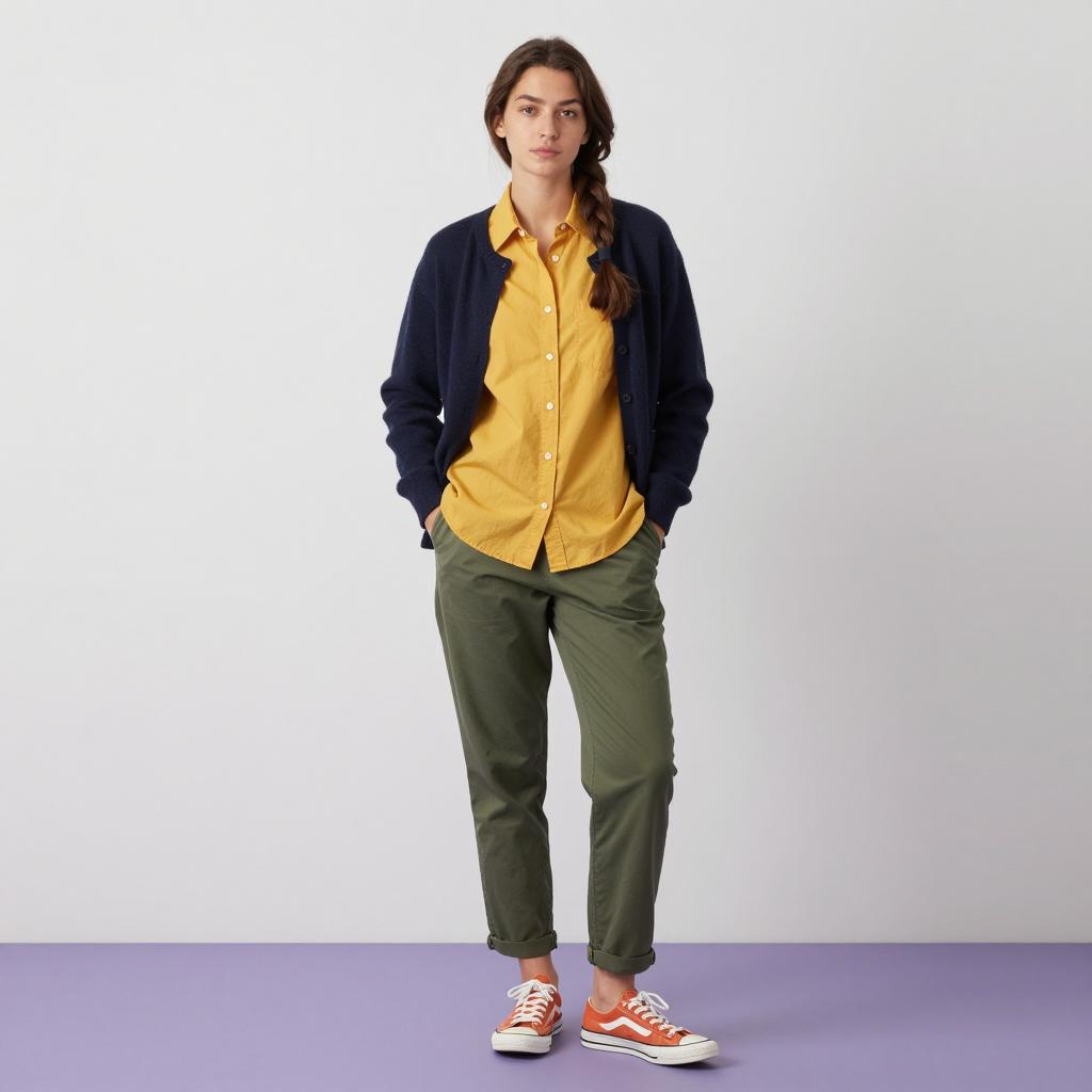Semi formal casual costume, photograph of a young woman, standing, full body, neutral expression, casual outfit, yellow button-up shirt, dark blue cardigan, olive green pants, orange and white sneakers, hands in pockets, long brown hair in a side braid, white background, purple floor, studio lighting, realistic style, contemporary fashion, slightly centered, simple background, natural light, relaxed posture