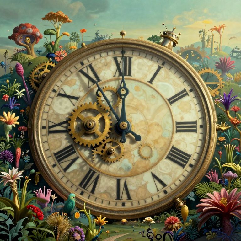 Imagine an ethereal dreamscape where the boundary between reality and fantasy blurs, reminiscent of Salvador Dali's surrealism. From a bird's-eye view perspective, focus on the intricate details of an expansive clock mechanism that stretches into infinity, its gears and cogs intertwining with lush gardens and exotic flora in a mesmerizing display. Soft, ethereal light illuminates this scene, casting long shadows that evoke mystery and introspection, inviting viewers to explore the depths of their own subconscious.